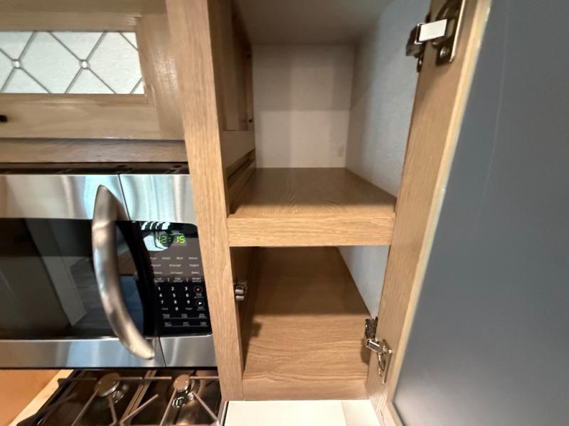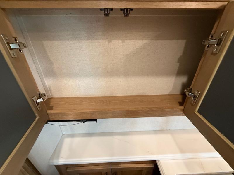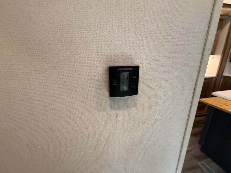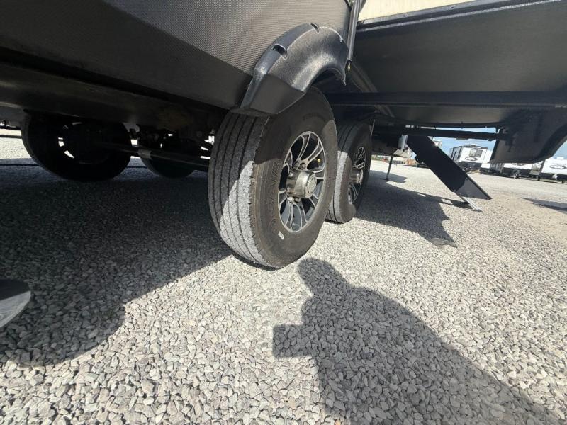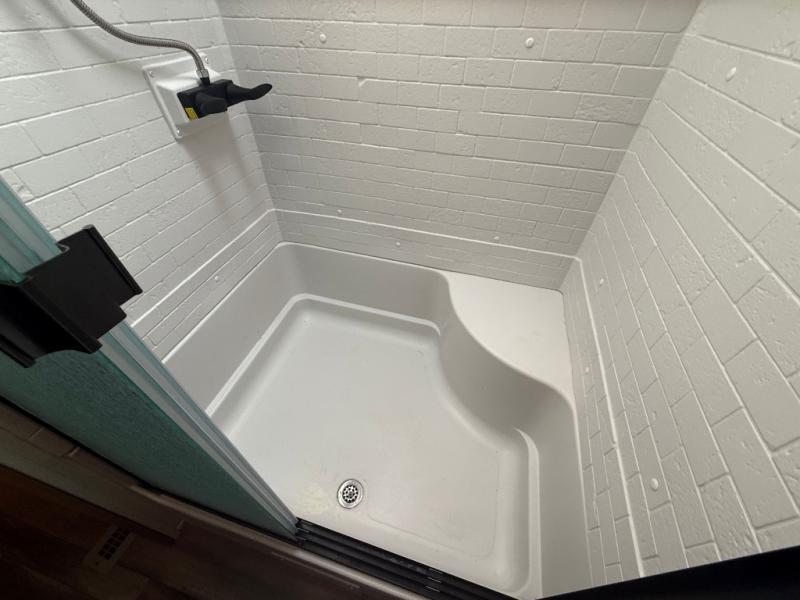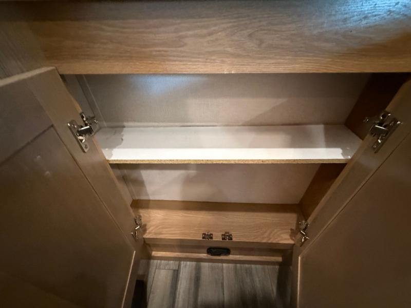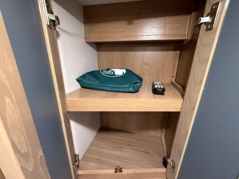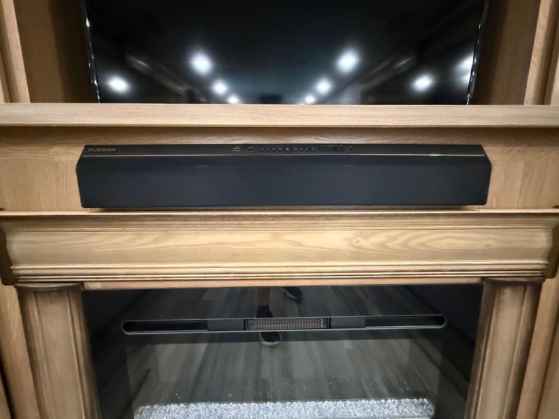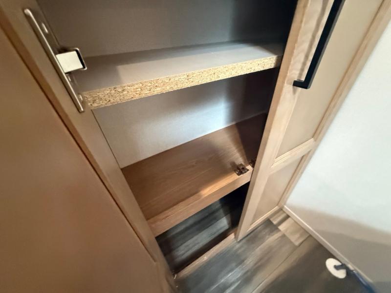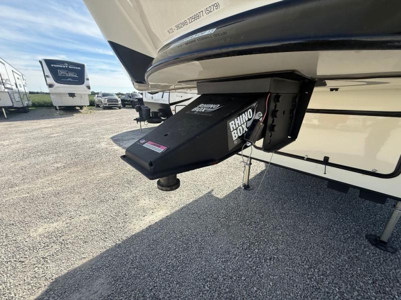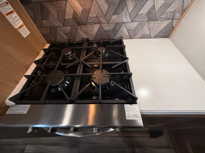 It's a clean decision with a bath and a half to take this fifth wheel on your next adventure! The front living area includes opposing EZ glide couches, 65" theater seating, and a front entertainment with a 50" LED pop up TV and fireplace for a cozy evening indoors. You can convert this area to a bedroom at night for the kiddos or guests, and the front windshield will provide natural light during the daytime. Prepare meals on the Furrion four burner cooktop, and leftovers can go in the 15 cu. ft. residential refrigerator. You and your spouse will love the master suite that includes a king bed slide, plenty of storage space, and an entrance into the full rear bathroom with a dual sink vanity to come in handy when getting ready each day. There is even a space prepped to add an optional washer and dryer if you plan to stay awhile!