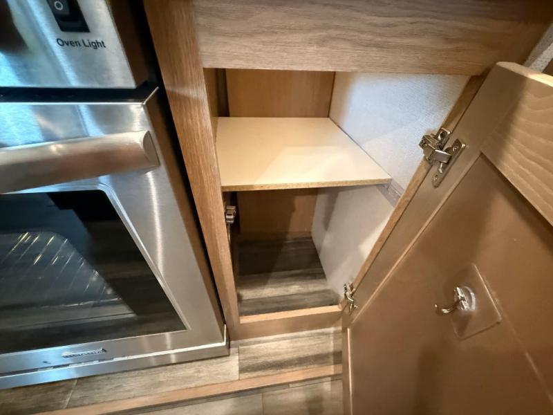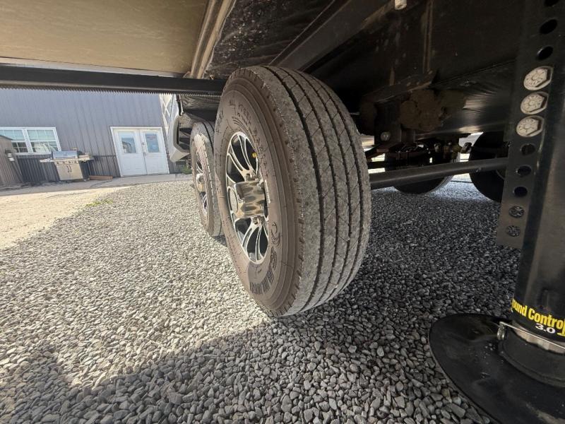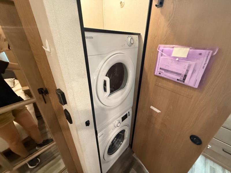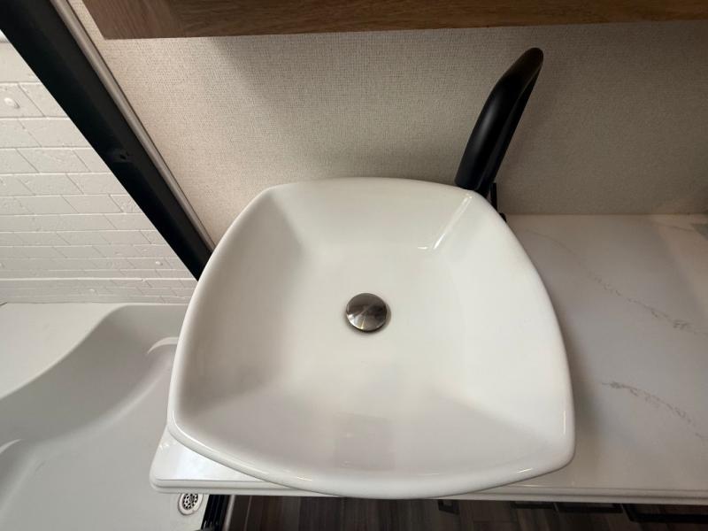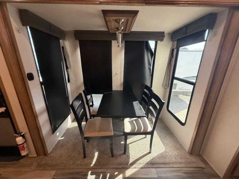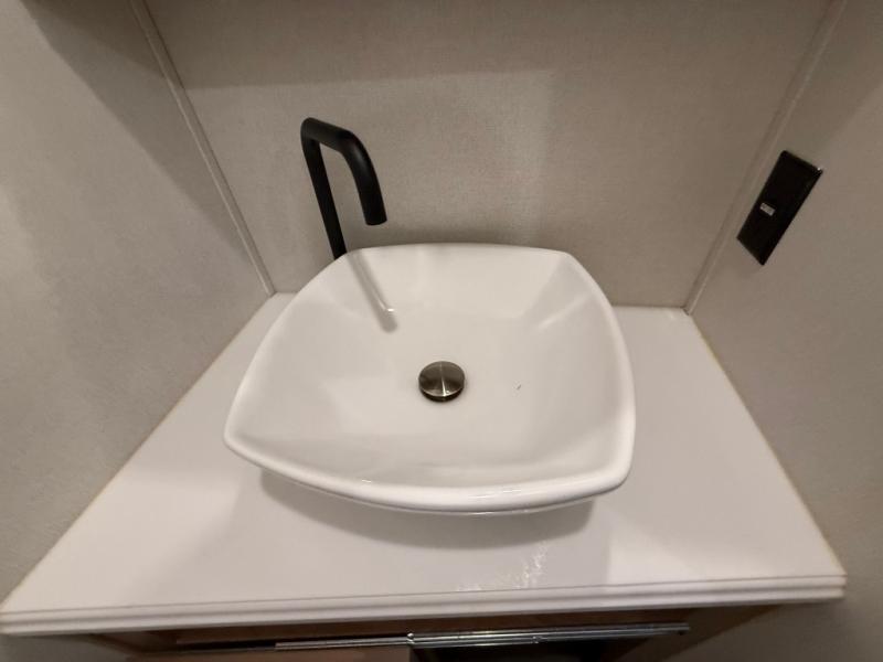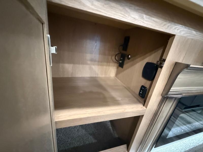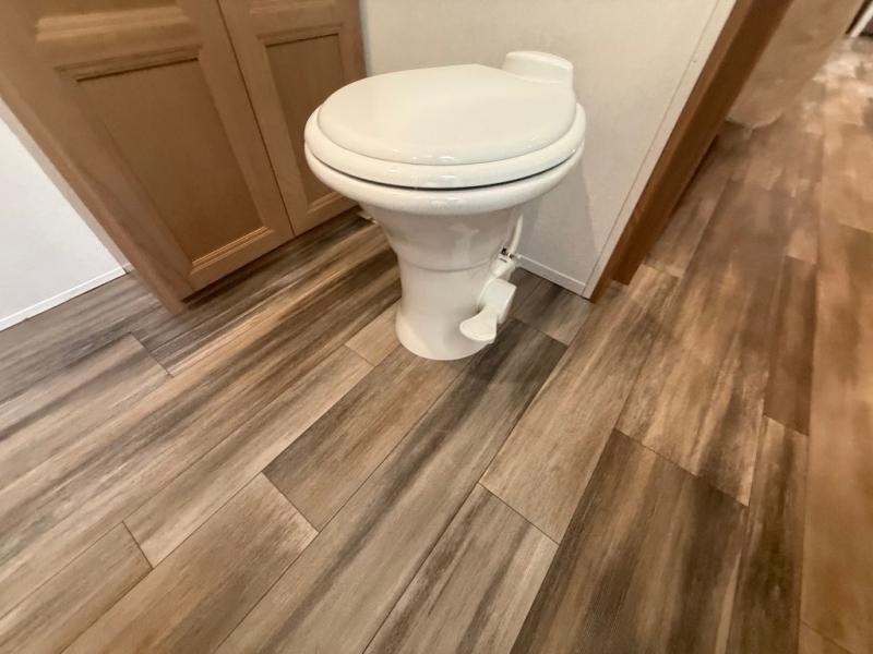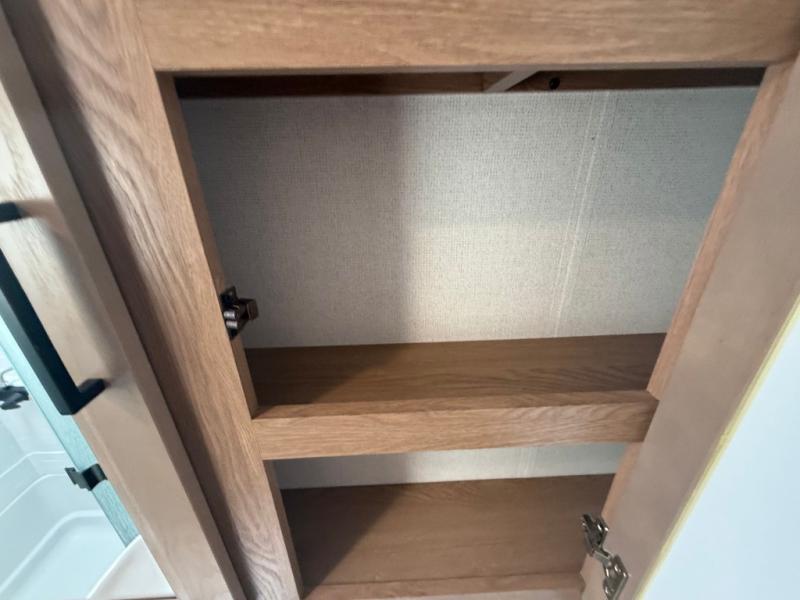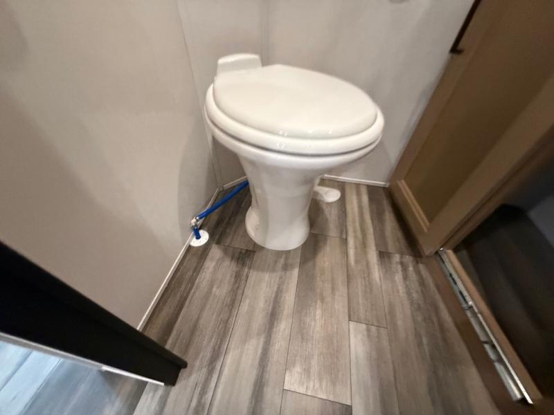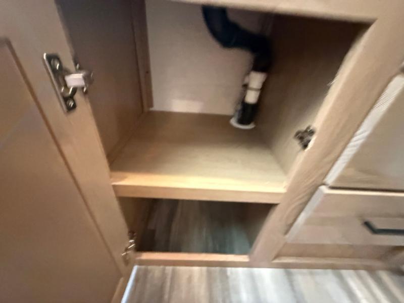 It's a clean decision with a bath and a half to take this fifth wheel on your next adventure! The front living area includes opposing EZ glide couches, 65" theater seating, and a front entertainment with a 50" LED pop up TV and fireplace for a cozy evening indoors. You can convert this area to a bedroom at night for the kiddos or guests, and the front windshield will provide natural light during the daytime. Prepare meals on the Furrion four burner cooktop, and leftovers can go in the 15 cu. ft. residential refrigerator. You and your spouse will love the master suite that includes a king bed slide, plenty of storage space, and an entrance into the full rear bathroom with a dual sink vanity to come in handy when getting ready each day. There is even a space prepped to add an optional washer and dryer if you plan to stay awhile!