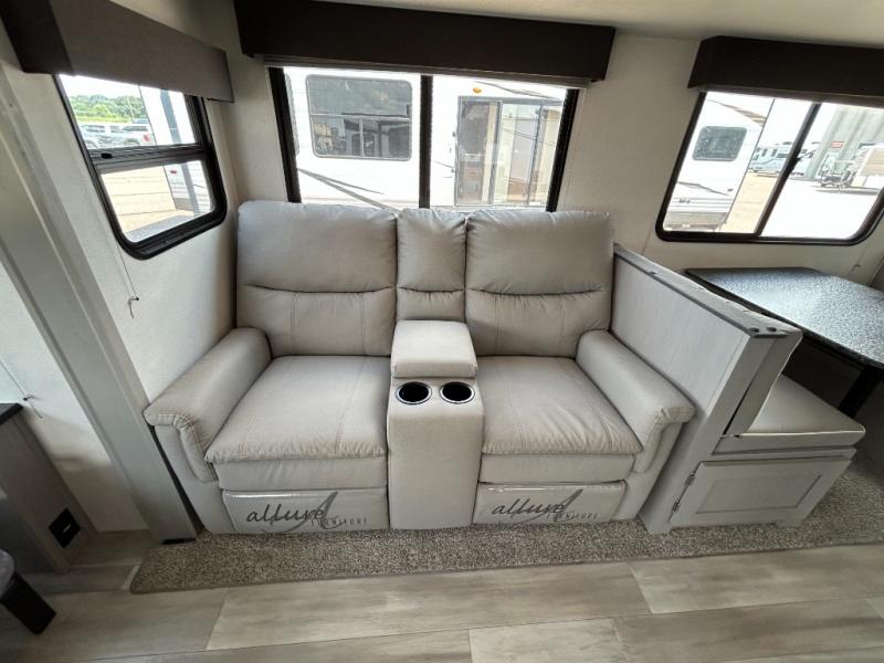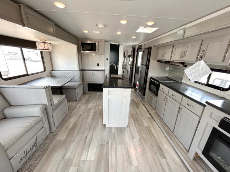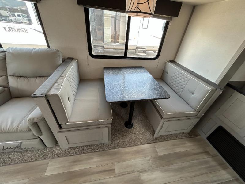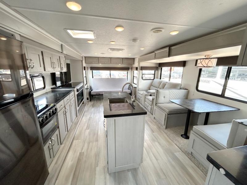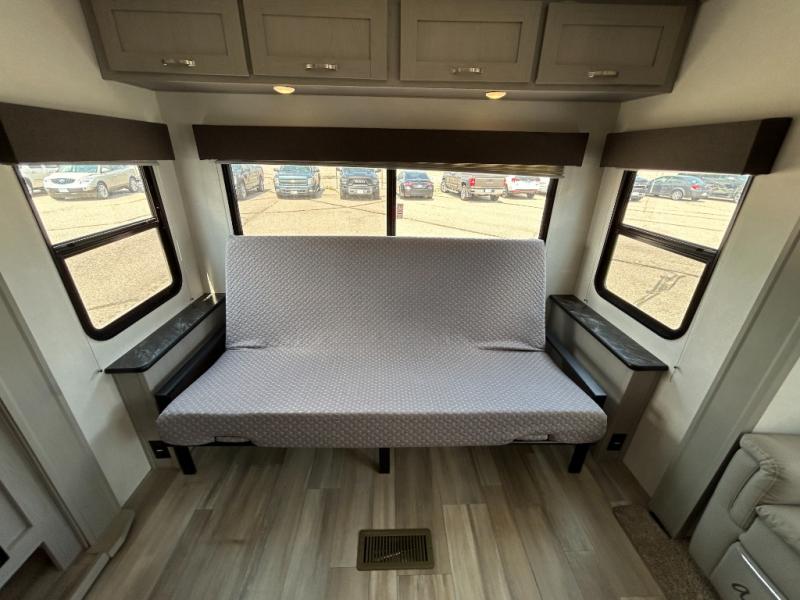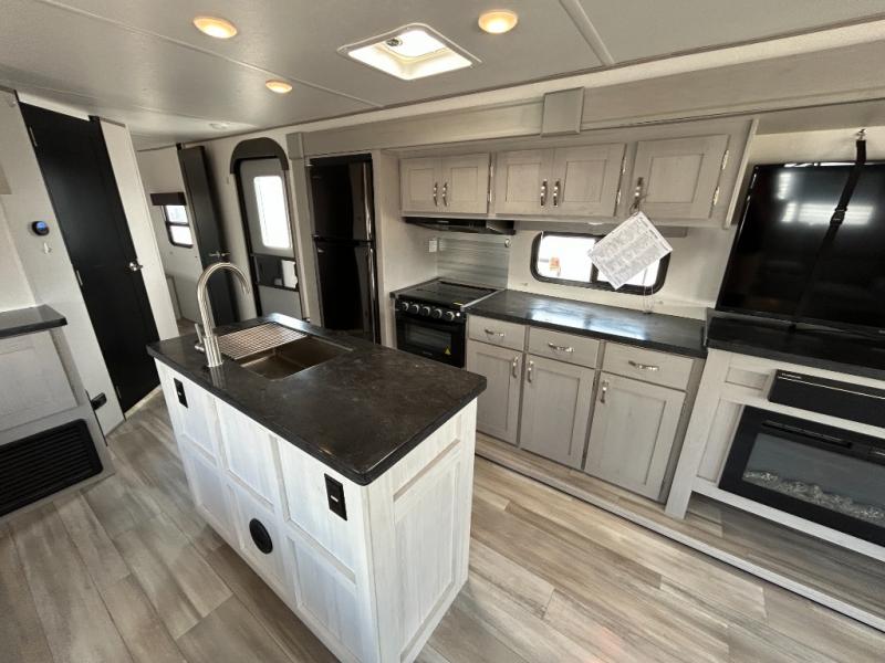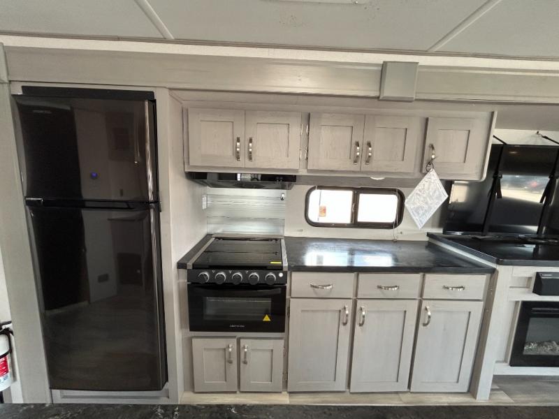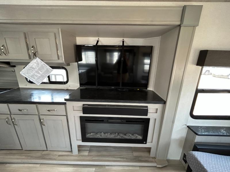 Looking to relax in the great outdoors, fish the pond, or hike the trails? You can do all of that and stay overnight when you have this trailer at the campsite! The front bedroom offers a queen bed with storage on each side, a second entry into the full bathroom, and a door to close for privacy. The main living and kitchen area is spacious thanks to the two opposing slides, and the rear sofa as well as the theater seats offer a coziness to the fireplace feature. You can eat at the booth dinette or play games while the cook makes a meal using the kitchen appliances.