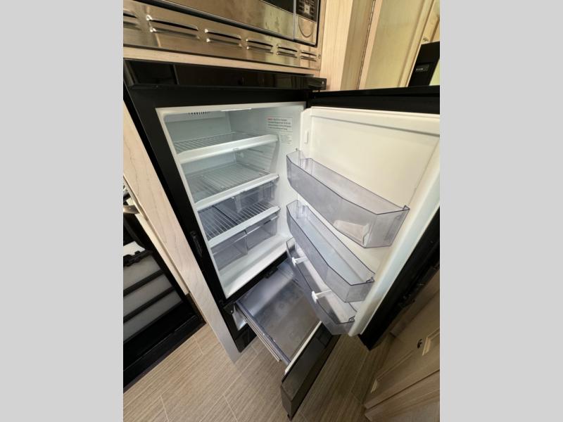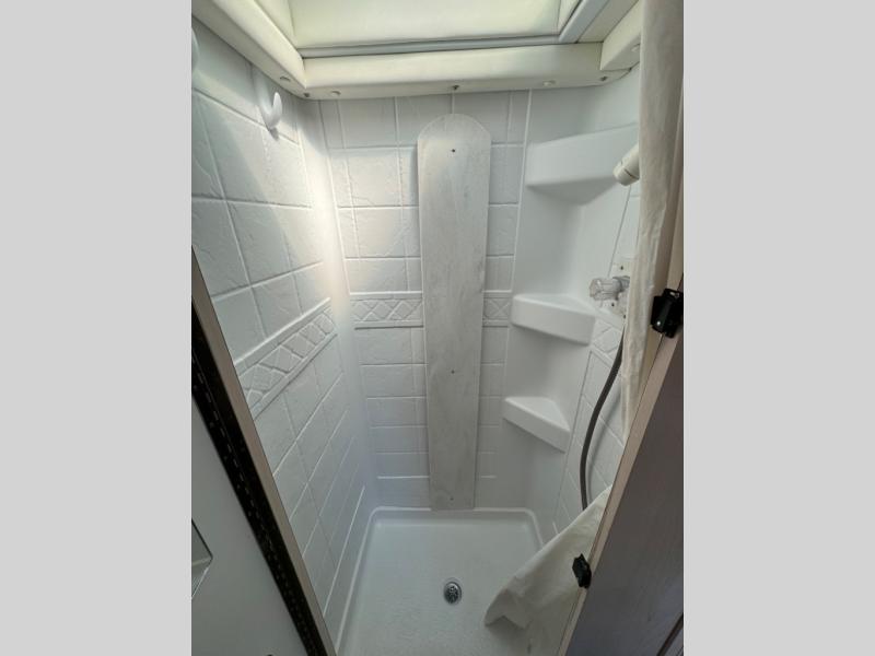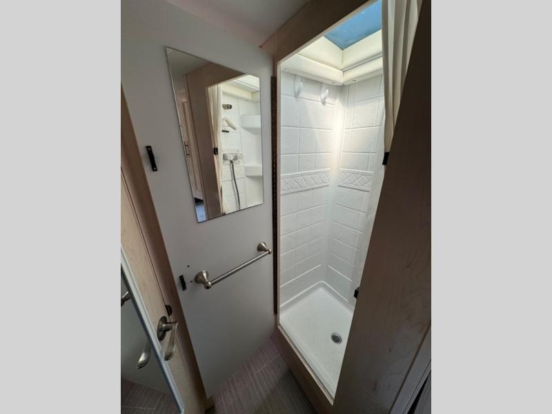 - Premium exterior: full-body automotive paint finish, dual rear wheels, aluminum wheels, LED lighting, large pass-through storage compartments, exterior shower.