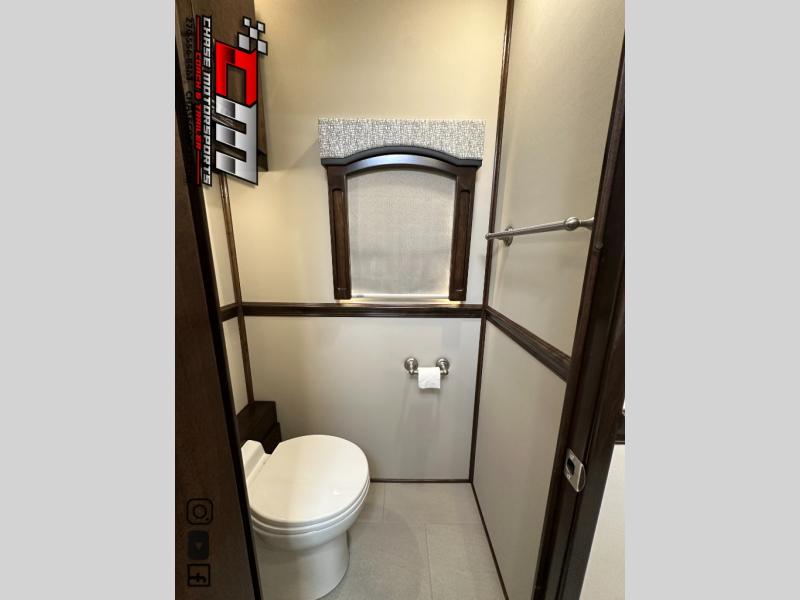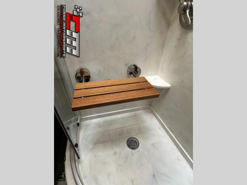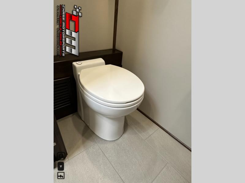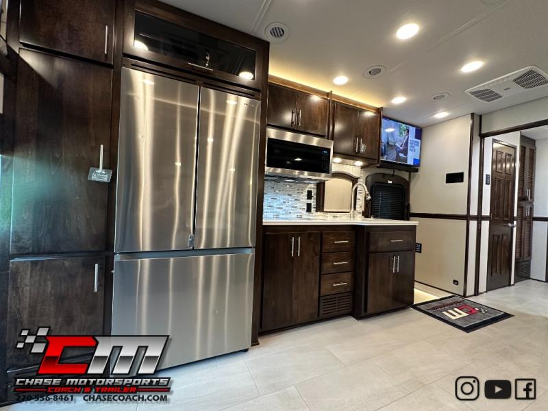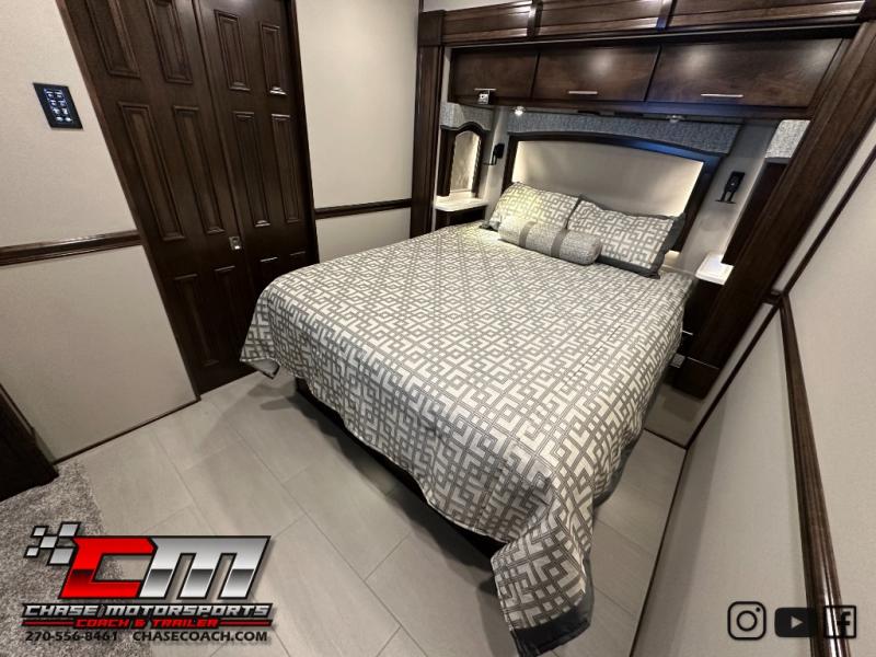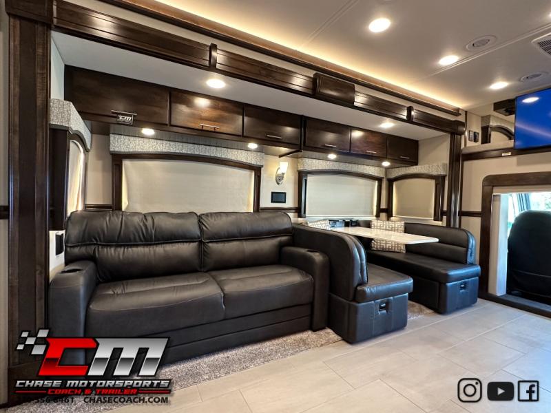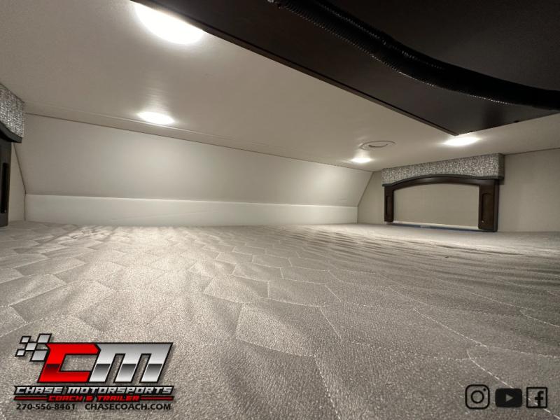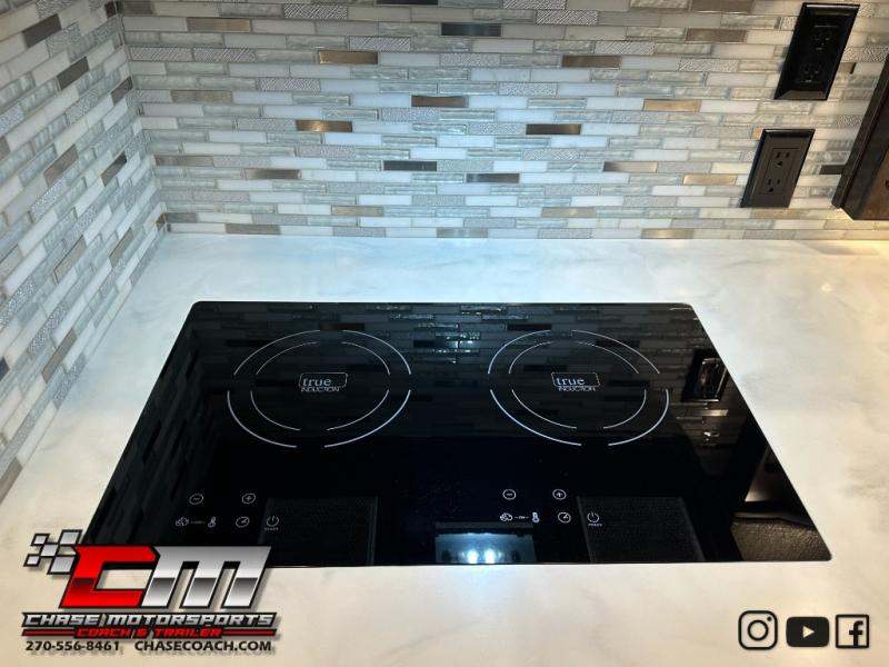 This coach is the one you've been waiting for with triple slides, sleeping space for six to seven, and all the luxury you can afford! Once you arrive at your destination, the chef of your crew can make lunch for everyone on the recessed gas cooktop or in the stainless steel convection oven. The booth dinette and hide-a-bed sofa will provide seating space for everyone, and the 43" LED 4K HDTV here will let you turn on a show while you eat. Two people can freshen up at once in the bath since there is a shower with a sink on one side and a private toilet on the other, or you can close the sliding doors to make one big bathroom! When you're ready to call it a night, the 66" x 80" queen bed in the rear private bedroom will be calling your name, and your guests can sleep on the living room furniture or the 60" x 95" bunk over cab!