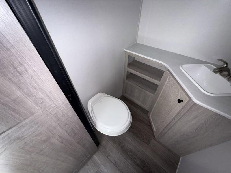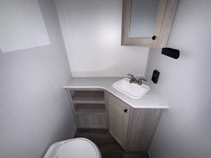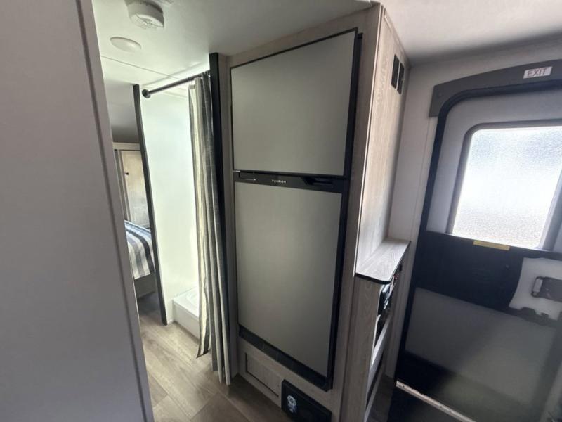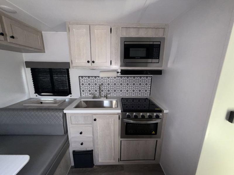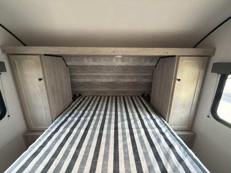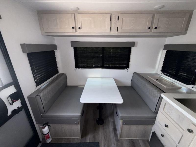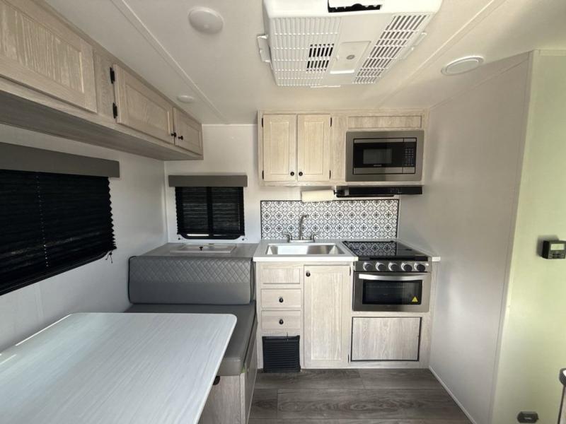 You'll be impressed with the features found in this single-axle travel trailer. The front bedroom includes an RV queen bed for a great night's rest, and there is a bedroom overhead cabinet for your things. The private toilet and sink are right across from the shower so two people can freshen up at once, and there is a rear booth dinette that will be perfect for meal times and additional sleeping space. This model also includes a kitchen to prepare meals each day, and you'll find a 10' patio awning outdoors to park your chairs under.