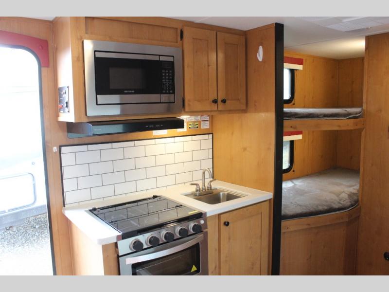 This is the perfect family-friendly travel trailer since it includes bunk beds for the little ones, and a front queen bed for you two. The full bath onboard will allow you to freshen up each day, and you can make meals using the fully-equipped kitchen. There is a booth dinette where you can dine together and sleep additional guests, and you'll find overhead cabinets for your belongings.
