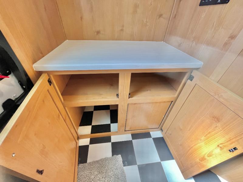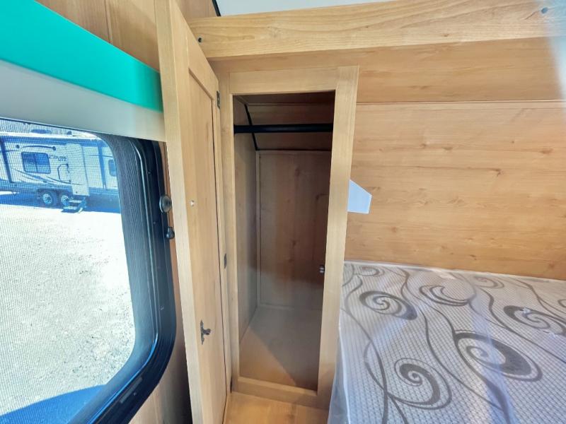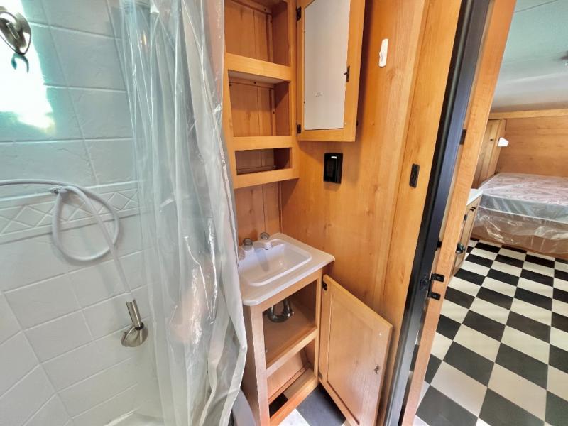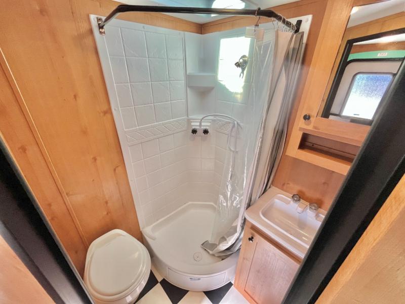 As you enter the unit, you will notice the rear corner bathroom which has a radius shower to freshen up in each morning. Eat meals, play games, and even sleep on the booth dinette with an entertainment center next to it for your enjoyment. The fully equipped kitchen not only has a 12V refrigerator, but also a three burner cooktop so you can cook more things at once. When you're ready to get a good night's rest, head to the front 60" x 76" queen bed with overhead cabinets to store your books or other necessities!