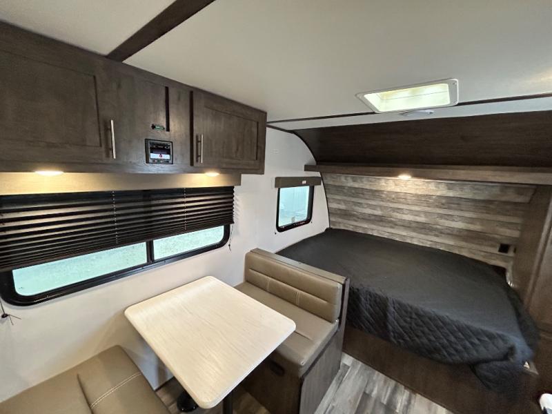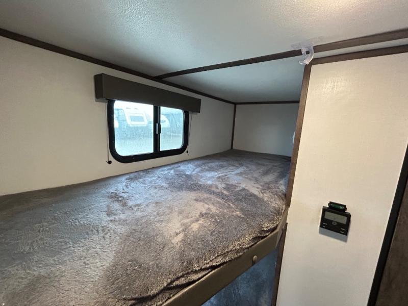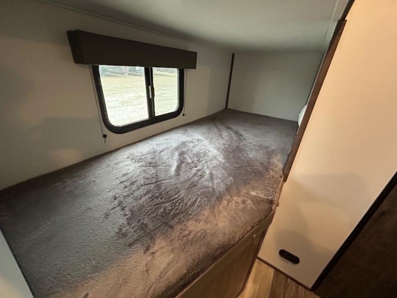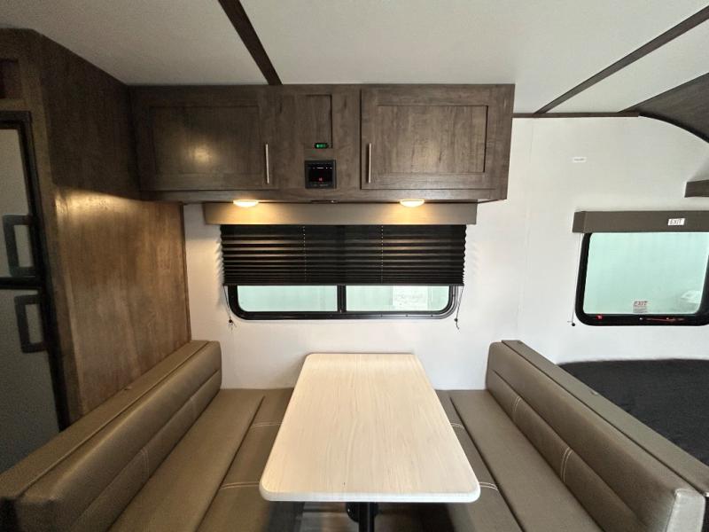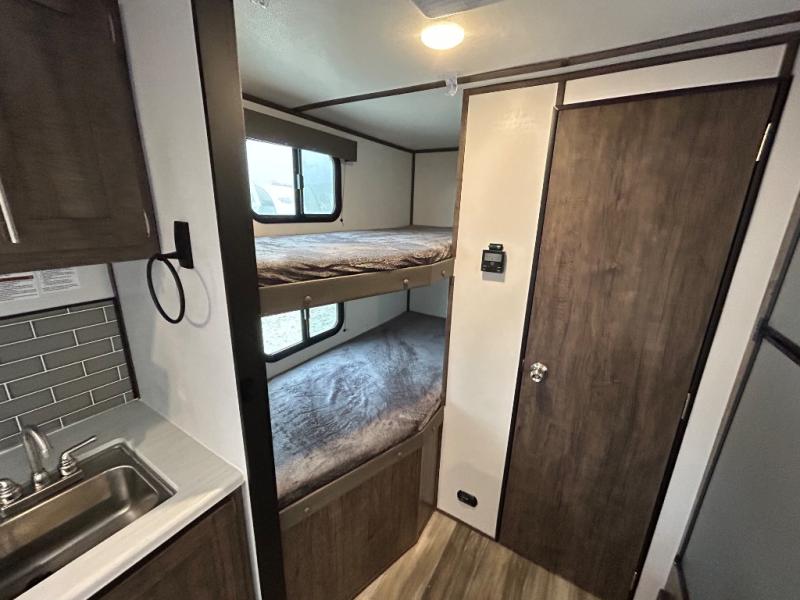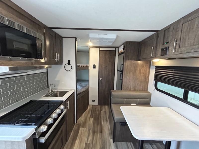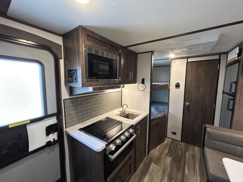 Your search is over for the perfect travel trailer with bunk beds included for your guests or little ones. You will have the RV queen bed up front to yourselves, plus there is a booth dinette for dining and additional sleeping space. A four burner cooktop will allow you to cook up your best meals, and the full bath is sure to come in handy after a day outdoors hiking or biking.