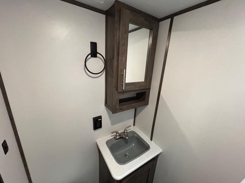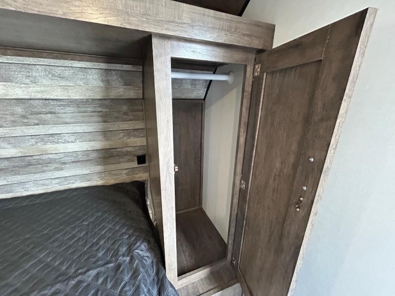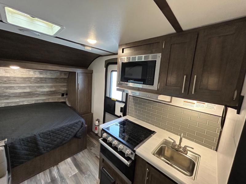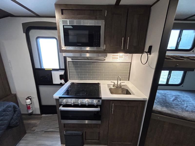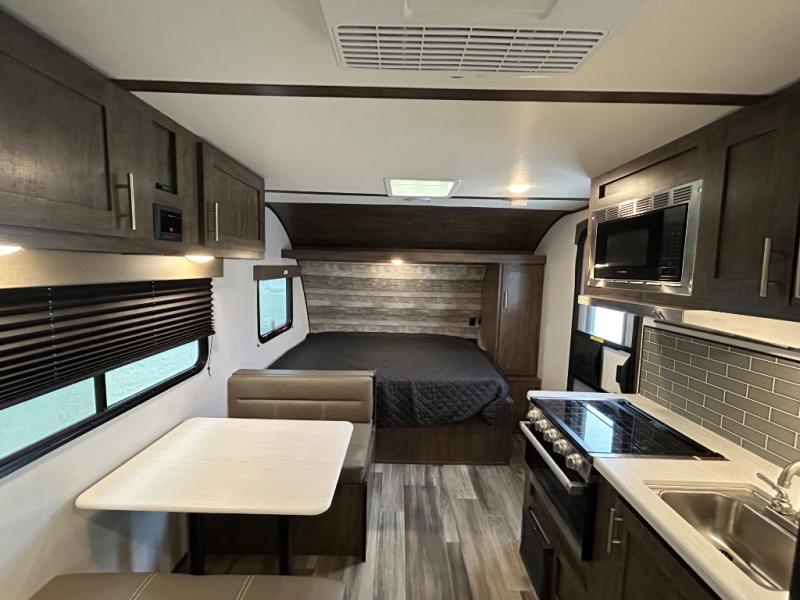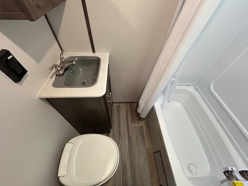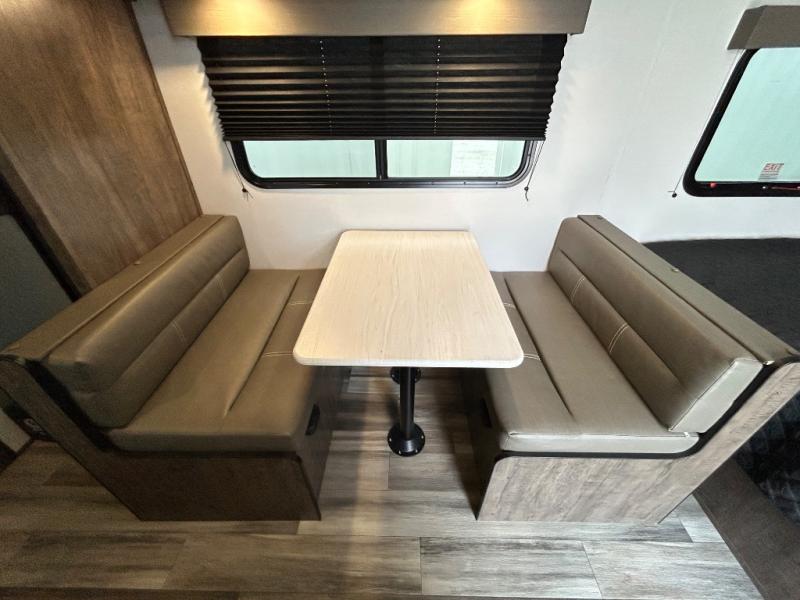 Your search is over for the perfect travel trailer with bunk beds included for your guests or little ones. You will have the RV queen bed up front to yourselves, plus there is a booth dinette for dining and additional sleeping space. A four burner cooktop will allow you to cook up your best meals, and the full bath is sure to come in handy after a day outdoors hiking or biking.