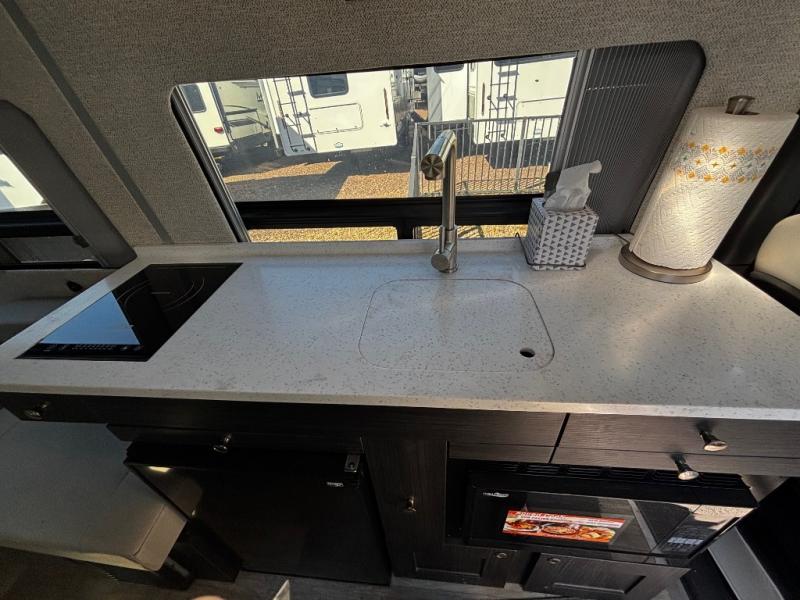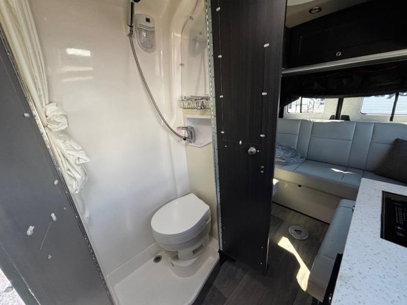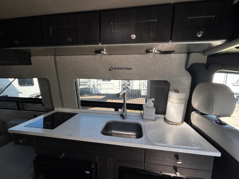 At just the right size for easy maneuverability, this Roadtrek feels like driving a van but offers the comfort of a full motorhome. The rear sofa provides multiple functions—lounging space during the day and a roomy king or twin bed setup at night. The expansive galley makes cooking simple and enjoyable, while the wardrobe and smart storage design keep everything neatly in its place. With the wet bath onboard, you can freshen up anywhere, eliminating the need to rely on campground facilities.