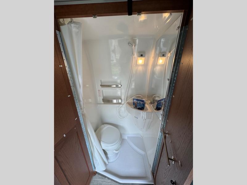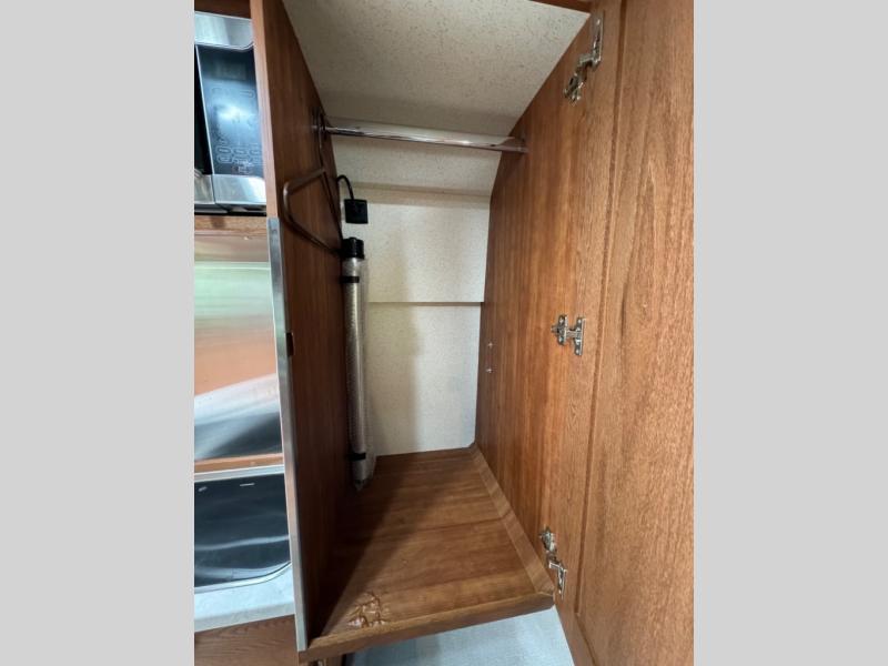 This Play Slumber Roadtrek Class B gas motorhome offers an open-concept center aisle for storage of larger items and rear sofas that can easily convert into two twin-size beds or one king-size bed. The pop-top sleeping area allows you to have additional sleeping space with its large bed and storage tray with charging ports. The galley kitchen features a 5.3 cubic foot refrigerator, propane stove, microwave, and flip-up countertop extension with a charging station, and there are also shelves under the sink, a large pot drawer, and a pantry slide for storage. The wet bath offers you a marine toilet, sink, and shower to clean up at any point during your trip, and this coach has also been pre-wired for a TV.
