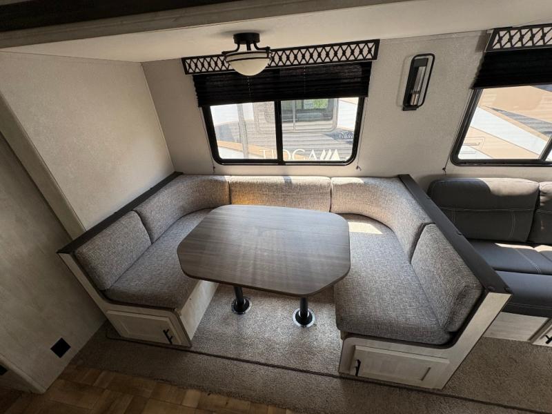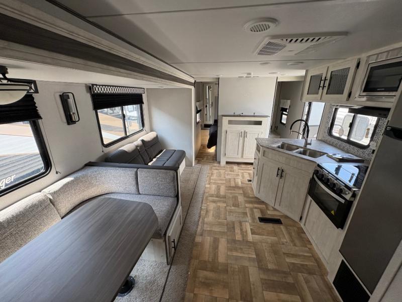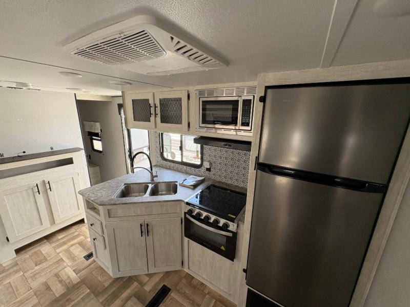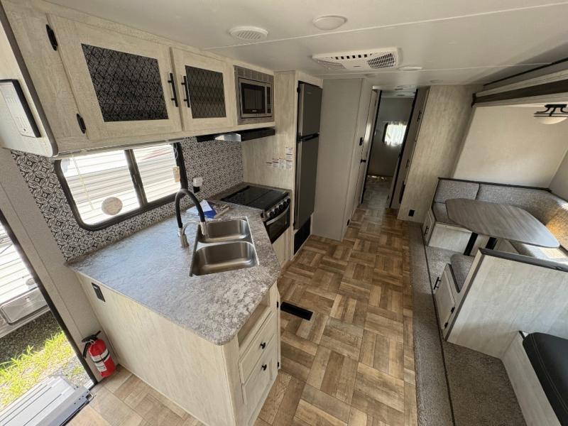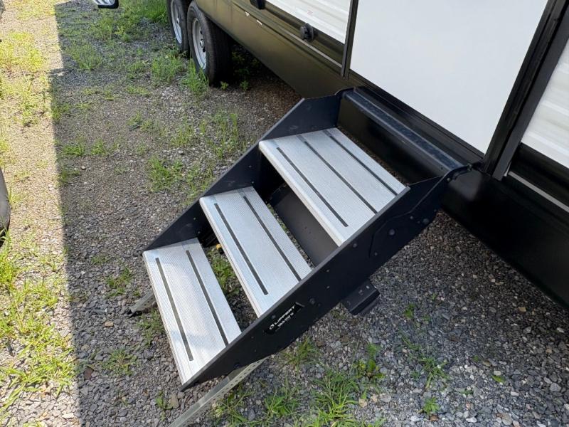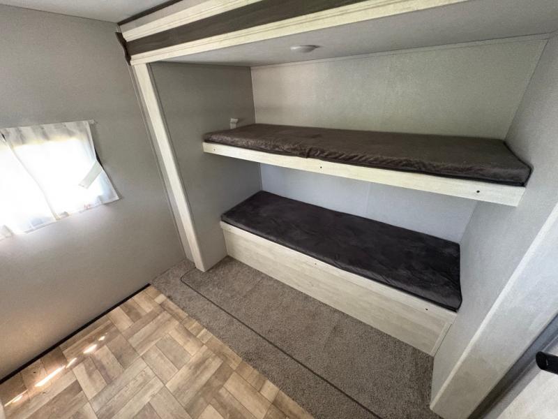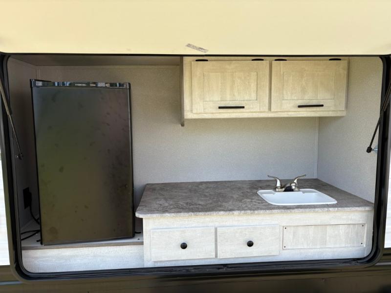 Get ready to stay awhile each time you take this trailer to the campgrounds! You will never want to return home due to all the comfortable and spacious accommodations. You will have your own privacy in the front bedroom which includes dual entry doors and two wardrobes. The kids will have the bunkhouse in the rear that offers a slide out with bunk beds and another bunk with storage below on the opposite side. The full bathroom has an interior and exterior entry for total convenience, and the main entry door allows you to be in the kitchen and living area in no time. The kitchen offers full amenities including a pantry and 10 cu. ft. refrigerator, and the furniture slide out gives you more floor space, plus the sofa provides a place to relax. And the furniture doubles as extra sleeping space when needed. And don't forget about the outside kitchen and entertainment center when wanting to relax in the outdoors.