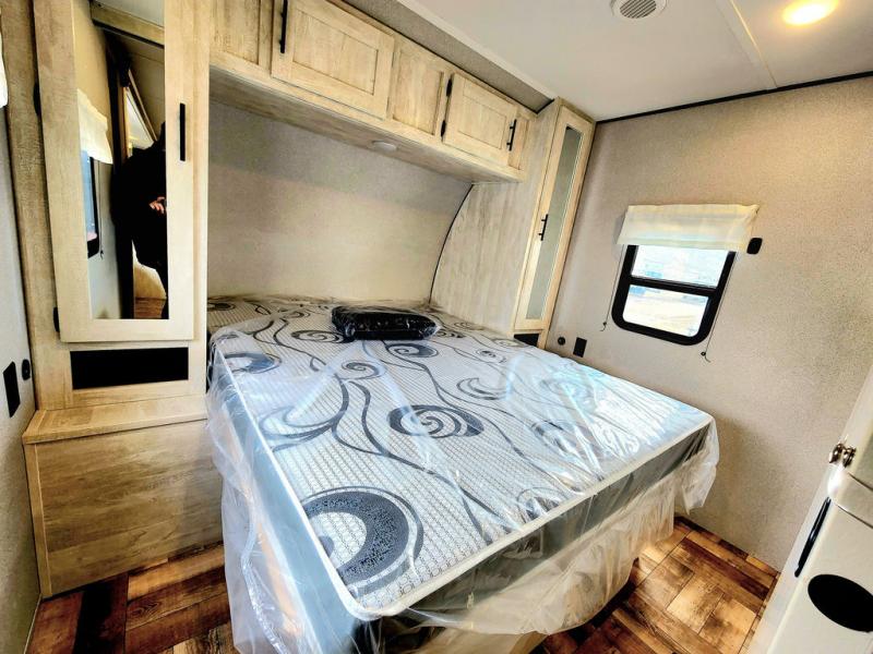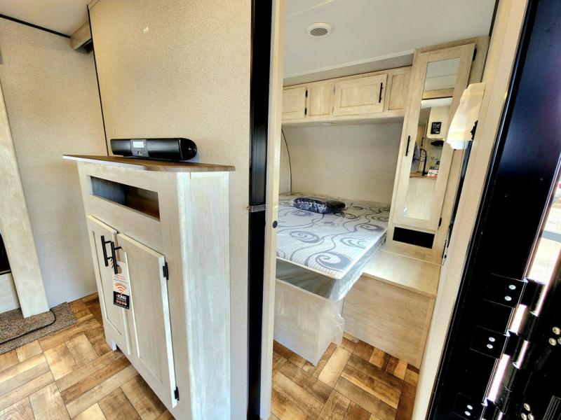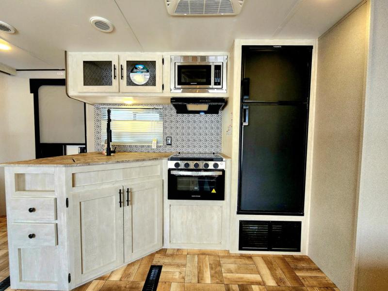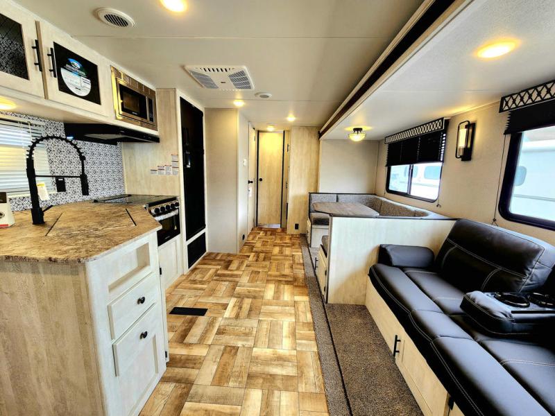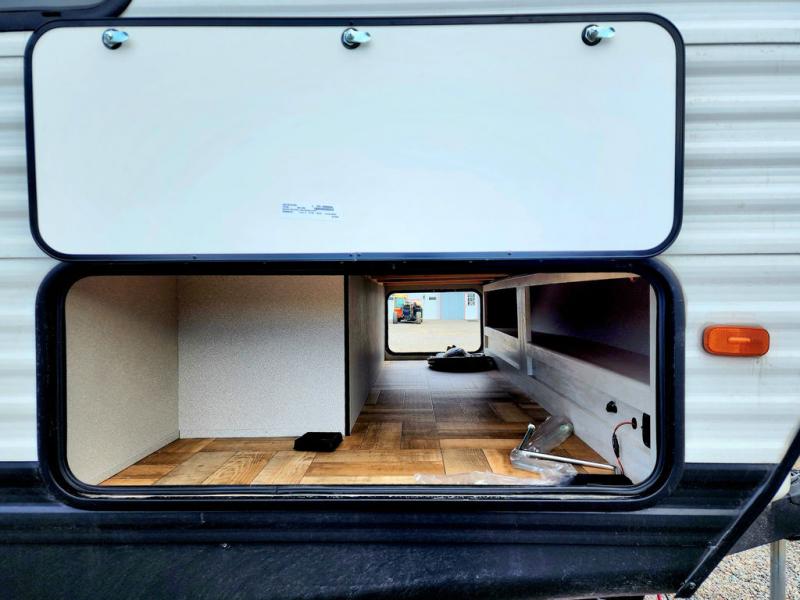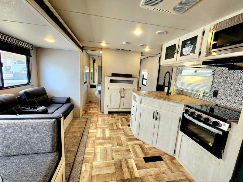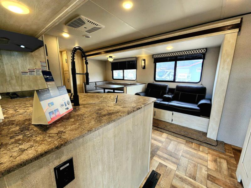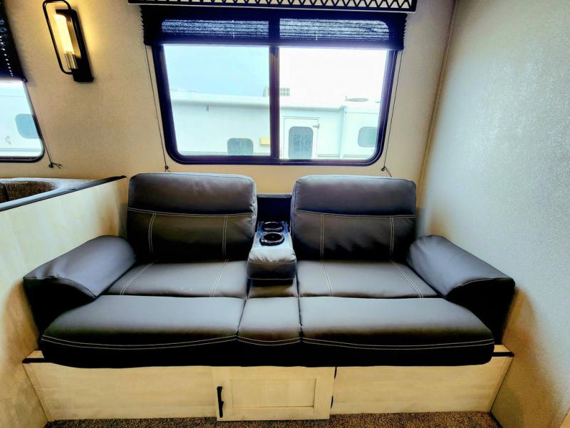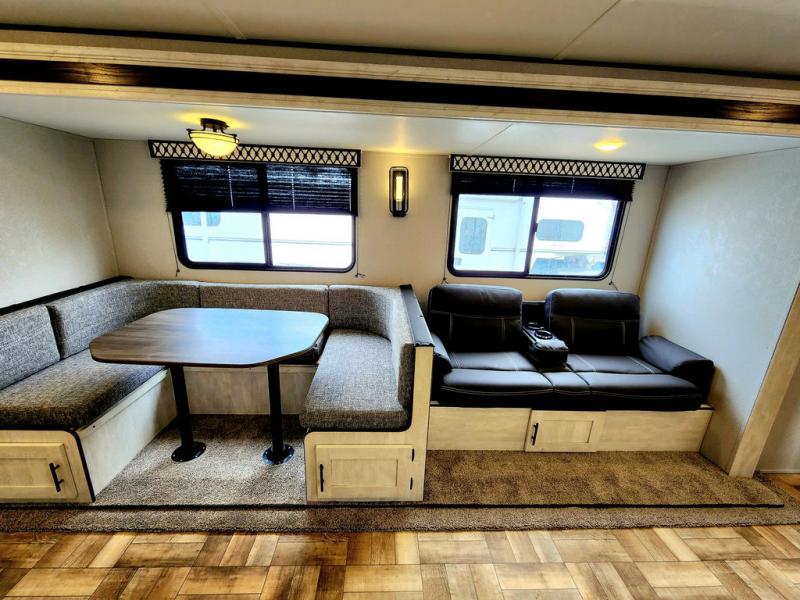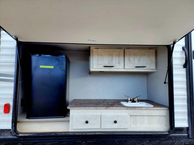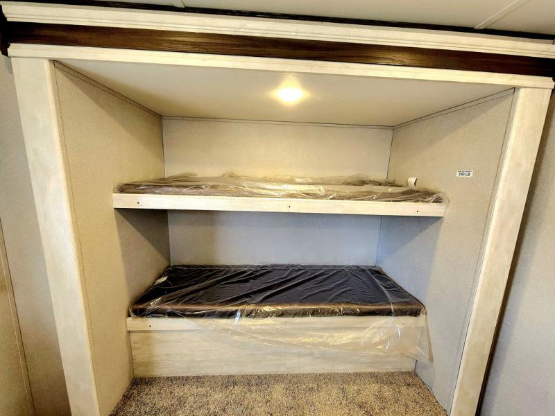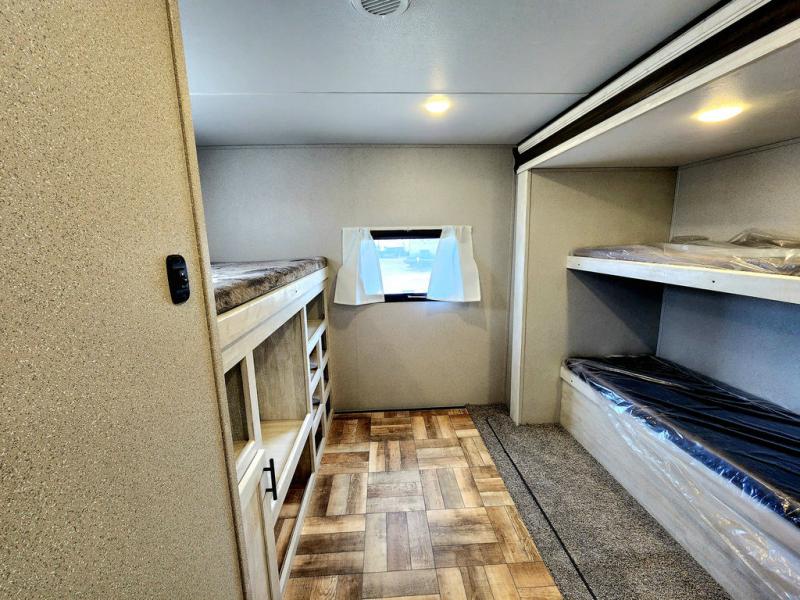 Get ready to stay awhile each time you take this trailer to the campgrounds! You will never want to return home due to all the comfortable and spacious accommodations. You will have your own privacy in the front bedroom which includes dual entry doors and two wardrobes. The kids will have the bunkhouse in the rear that offers a slide out with bunk beds and another bunk with storage below on the opposite side. The full bathroom has an interior and exterior entry for total convenience, and the main entry door allows you to be in the kitchen and living area in no time. The kitchen offers full amenities including a pantry and 10 cu. ft. refrigerator, and the furniture slide out gives you more floor space, plus the sofa provides a place to relax. And the furniture doubles as extra sleeping space when needed. And don't forget about the outside kitchen and entertainment center when wanting to relax in the outdoors.