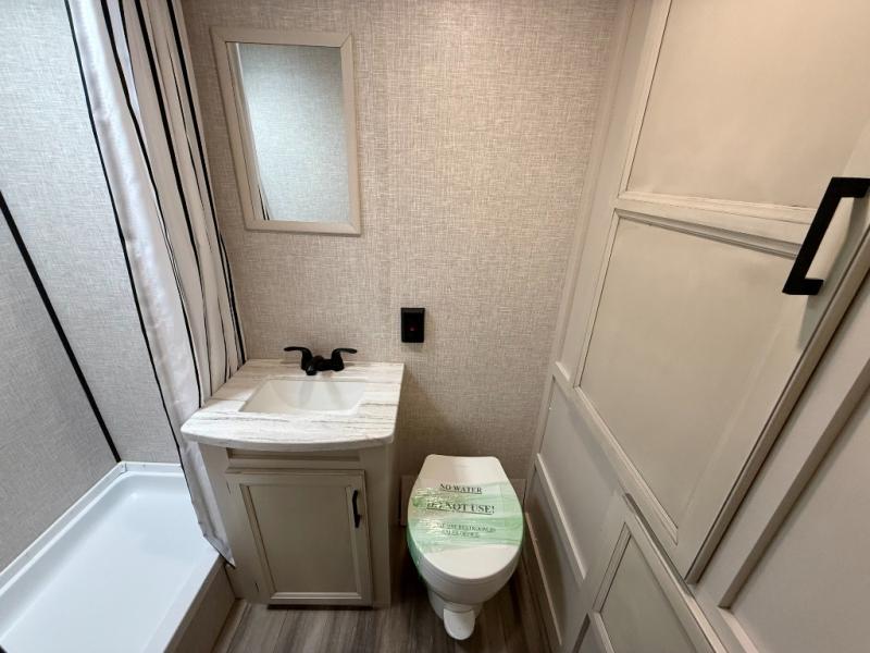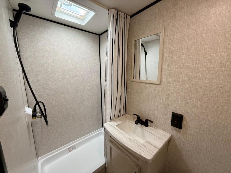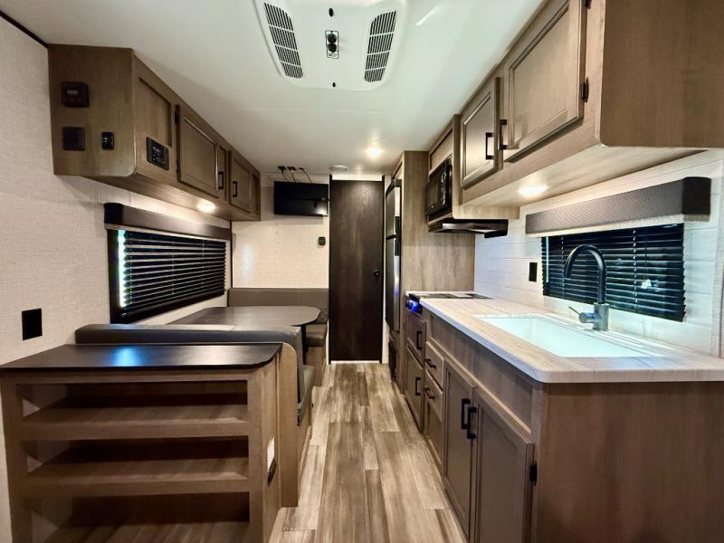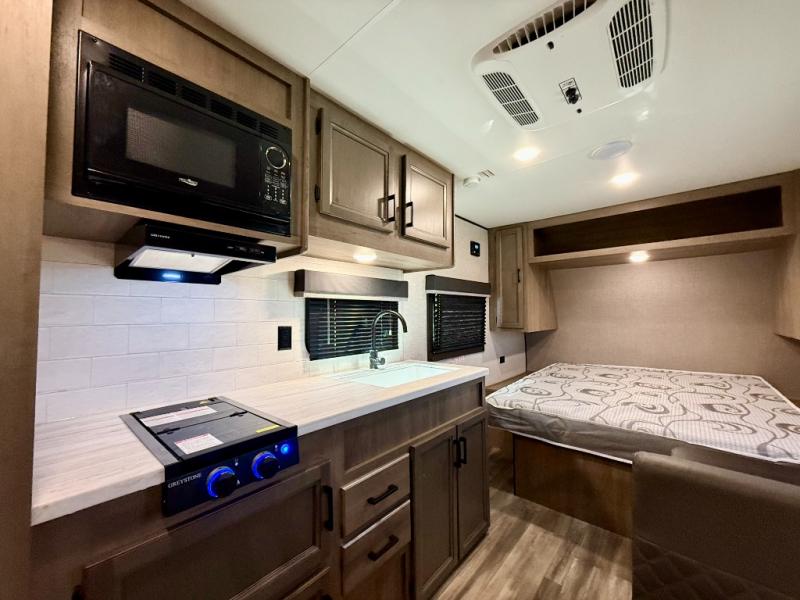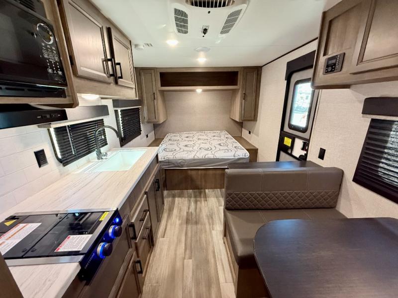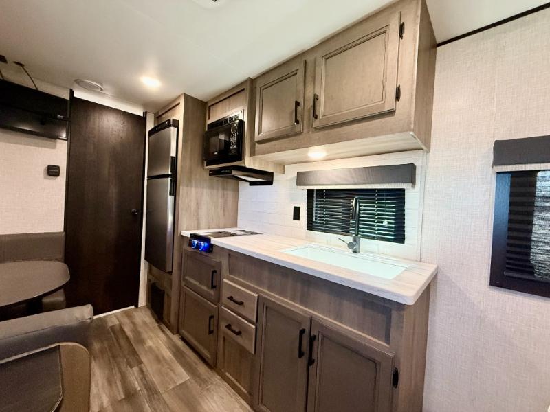 This cozy single axle travel trailer can sleep three people comfortably thanks to the front walk-around bed and the booth dinette. There is a full rear bath with a foot flush toilet, a powered bath vent, plus a bath wardrobe for clean towels and toiletries. The full kitchen is complete with a three burner cooktop, a microwave oven, and a refrigerator to keep your perishables fresh. Start camping today at your favorite campground!