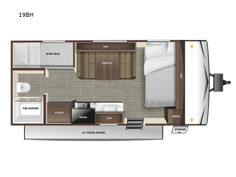 If you're in the market for a lightweight single axle travel trailer with bunk beds, you're in luck with this unit! You will have the front bed all to yourselves, and there is a wardrobe here to store your clothes. The chef can whip up lunch on the two burner cooktop, and you can dine at the booth dinette. If the weather is nice, you may just want to sit outdoors under the 13' power awning with LED lights. The rear corner bath includes a foot flush toilet and a tub/shower, and you'll find plenty of storage space throughout this model, including outside storage for charcoal, tackle boxes, and tools!