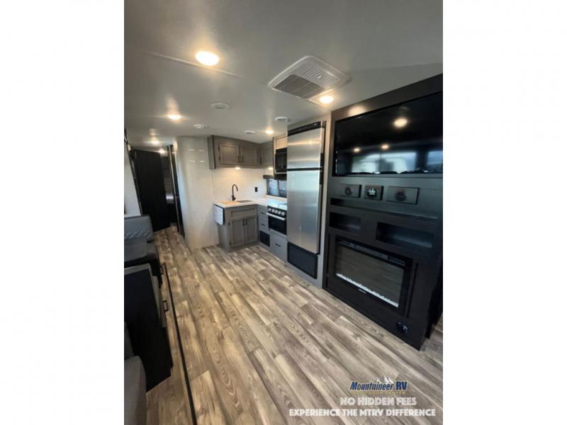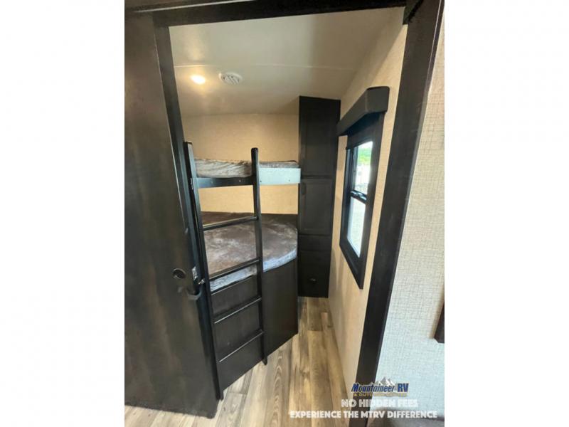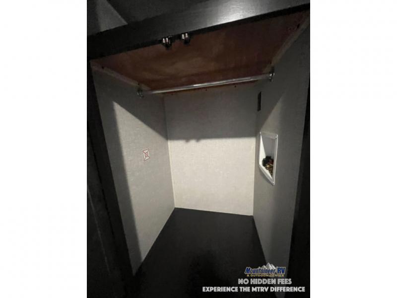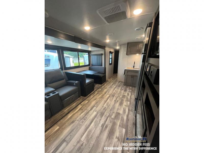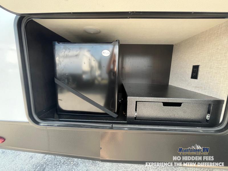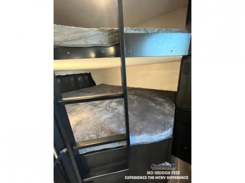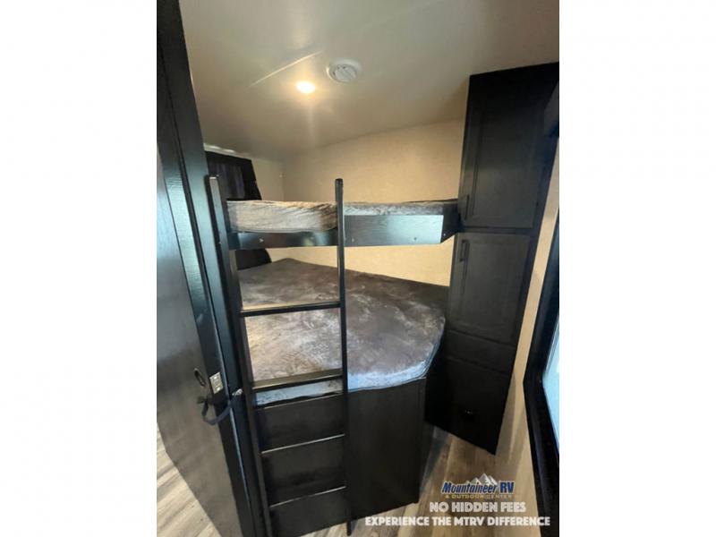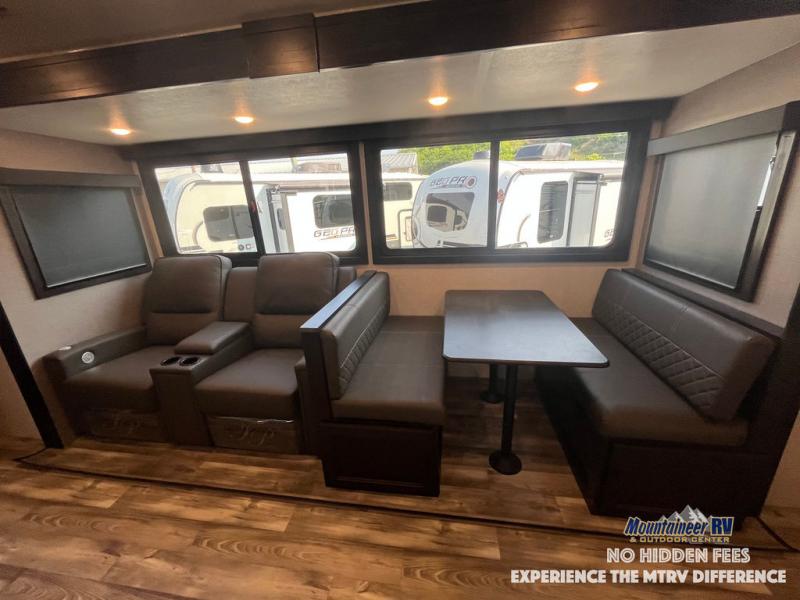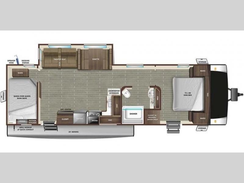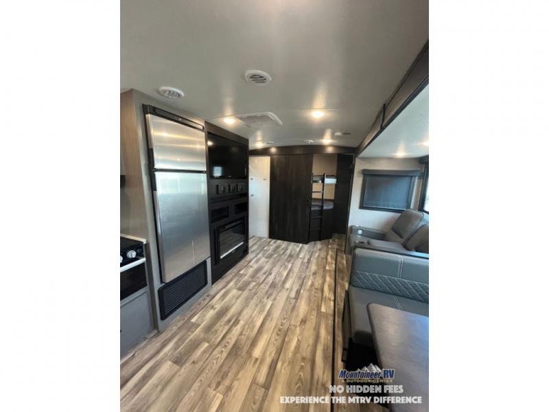 You can bring the whole family with you in this travel trailer! Your family and/or friends will appreciate having their own privacy with the rear bunkhouse which includes a set of queen bunks and a wardrobe for their clothes. You will have your own privacy with a separate front private bedroom which has a 72" x 80" king bed with wardrobes on either side, a closet that is prepped to add an optional washer and dryer, and even one of the dual entry doors to the unit. Keep everyone's bellies full creating meals and snacks with the three burner cooktop, 10 cu. ft. refrigerator, and the handy countertop extension. Enjoy your meals together as a family at the booth dinette then play a card game or relax on the theater seating across from the entertainment center. You even have an outside kitchen with a refrigerator to keep your beverage cold while you cook!