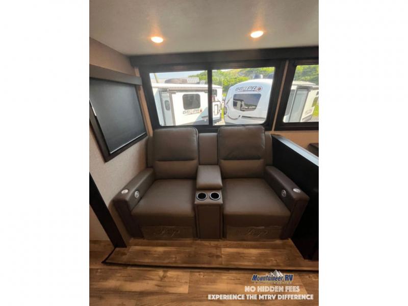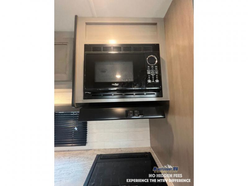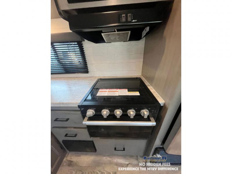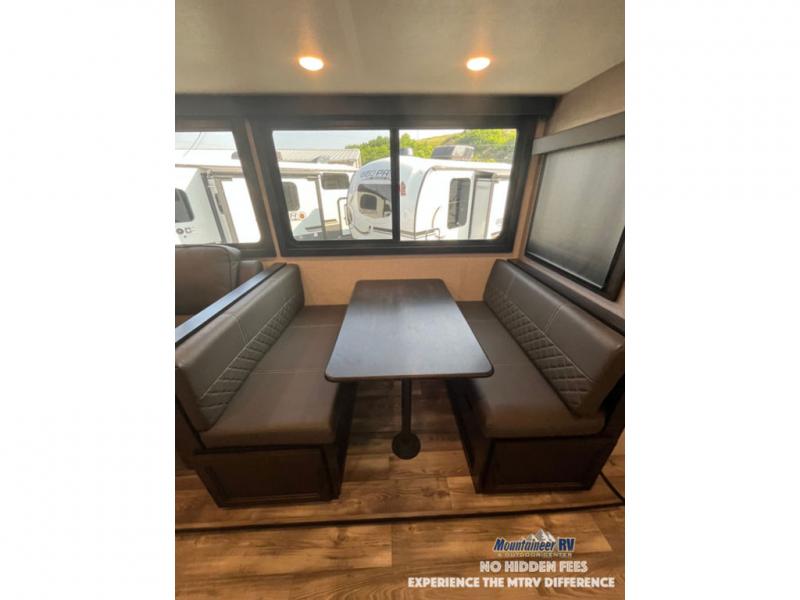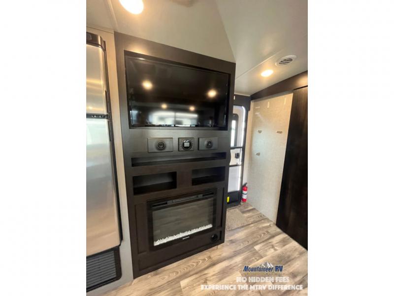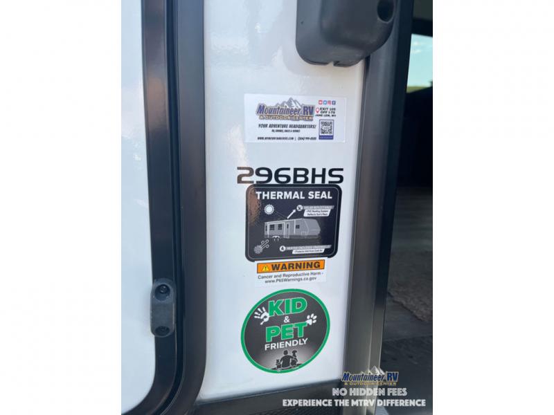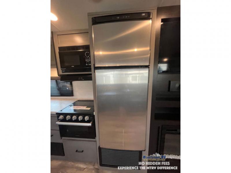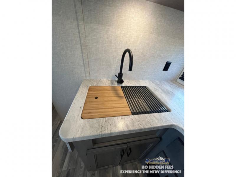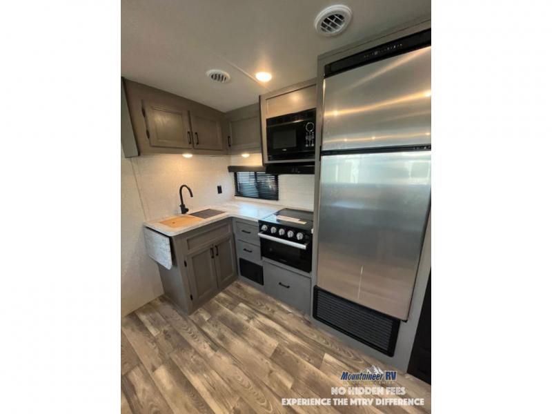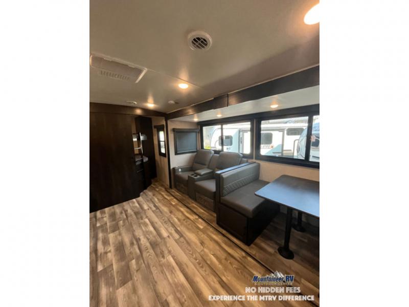 You can bring the whole family with you in this travel trailer! Your family and/or friends will appreciate having their own privacy with the rear bunkhouse which includes a set of queen bunks and a wardrobe for their clothes. You will have your own privacy with a separate front private bedroom which has a 72" x 80" king bed with wardrobes on either side, a closet that is prepped to add an optional washer and dryer, and even one of the dual entry doors to the unit. Keep everyone's bellies full creating meals and snacks with the three burner cooktop, 10 cu. ft. refrigerator, and the handy countertop extension. Enjoy your meals together as a family at the booth dinette then play a card game or relax on the theater seating across from the entertainment center. You even have an outside kitchen with a refrigerator to keep your beverage cold while you cook!