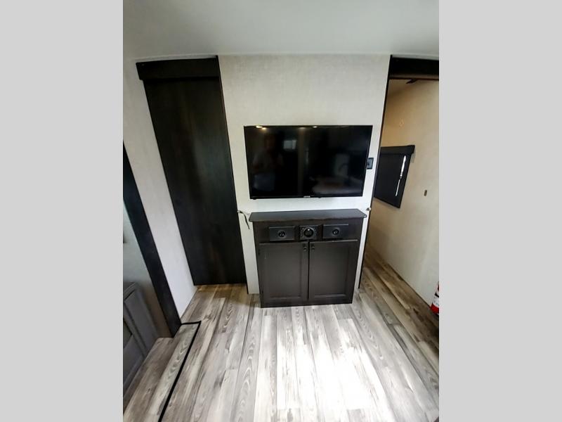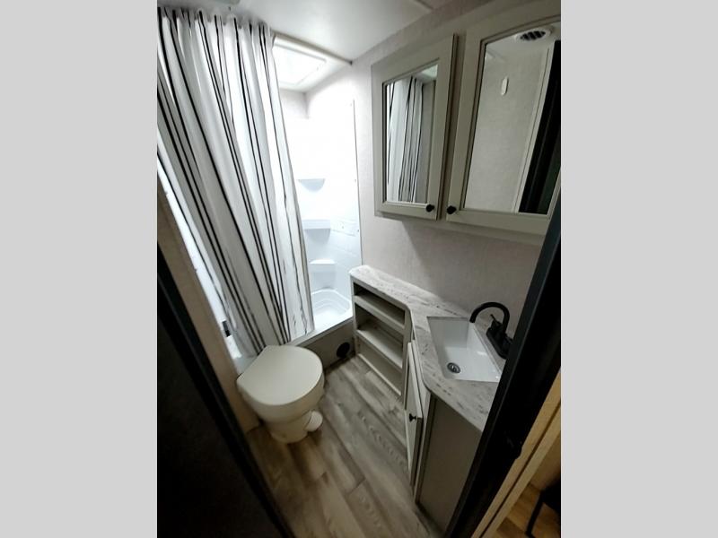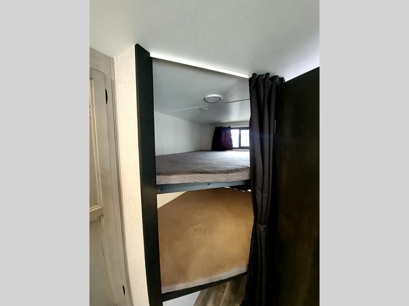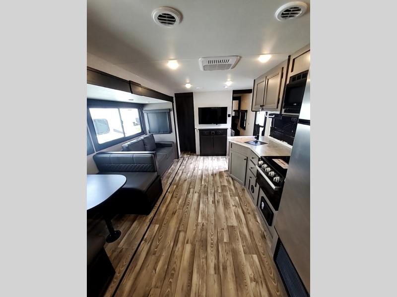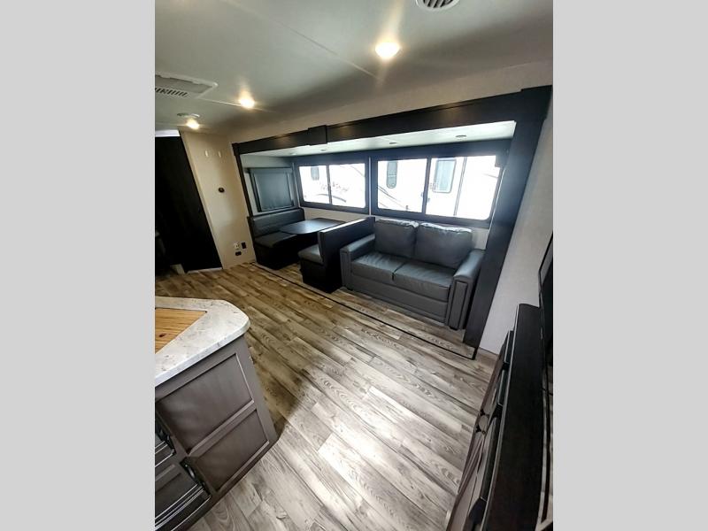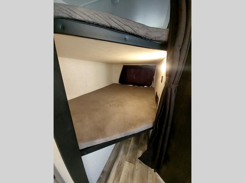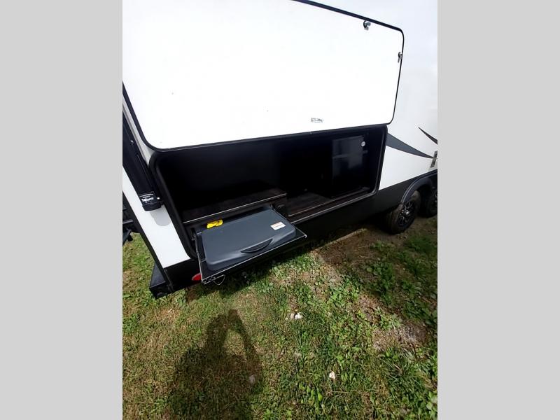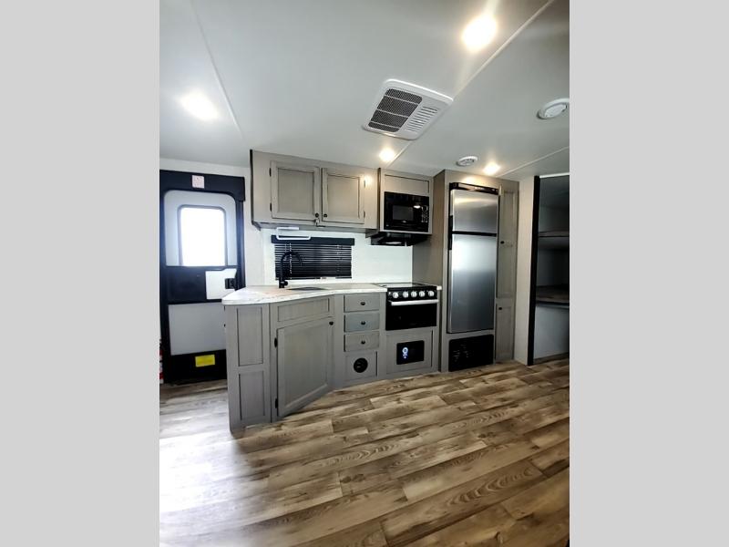 You will love the amount of storage space you'll find inside and outside this travel trailer. There is plenty of sleeping for a larger group also between the slide out in the main area with a dinette and tri-fold sofa, the double-size bunks next to the rear corner full bathroom, and the queen bed in the front bedroom with access to each side with its own sliding door. The cook will have full amenities including a pantry for storage, a single basin stainless steel under-mount kitchen sink with a residential high-rise faucet and overhead cabinets for more items. And they can cook on the outside kitchen with an exterior fridge for more beverages while others relax under the 20' 6" power awning with LED lighting so everyone can stay up late and enjoy the outdoors.