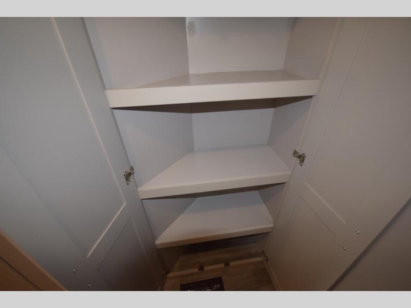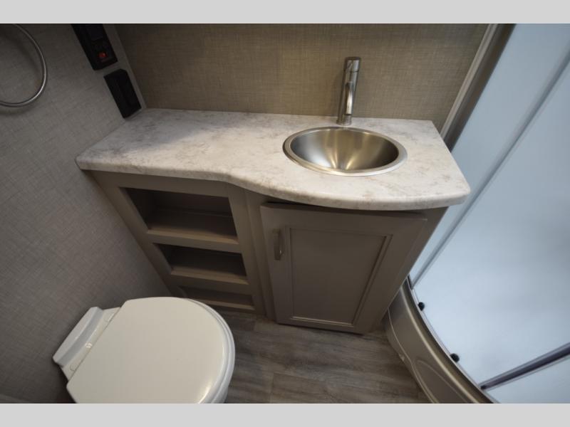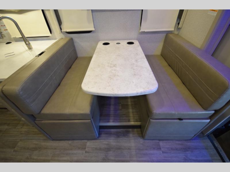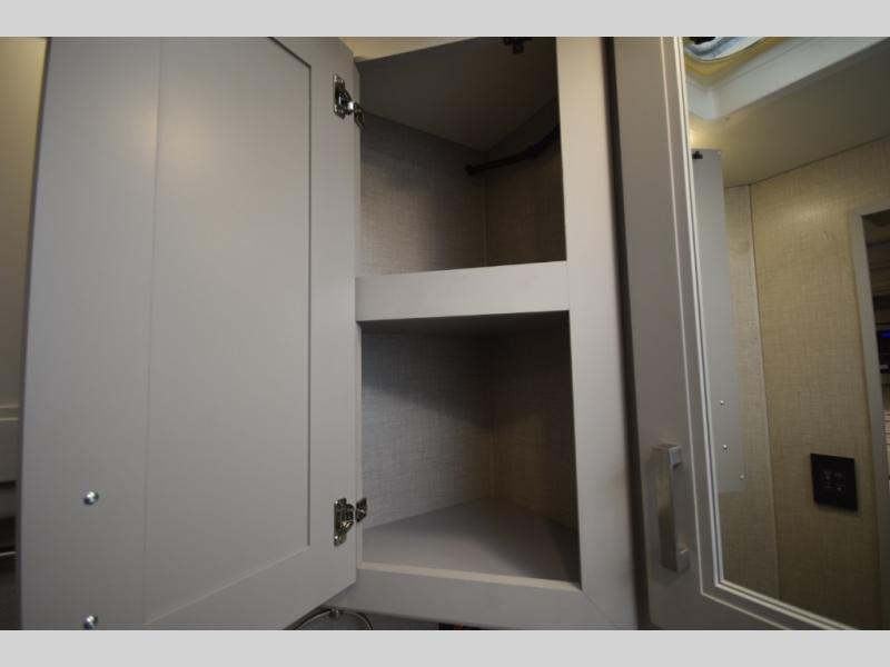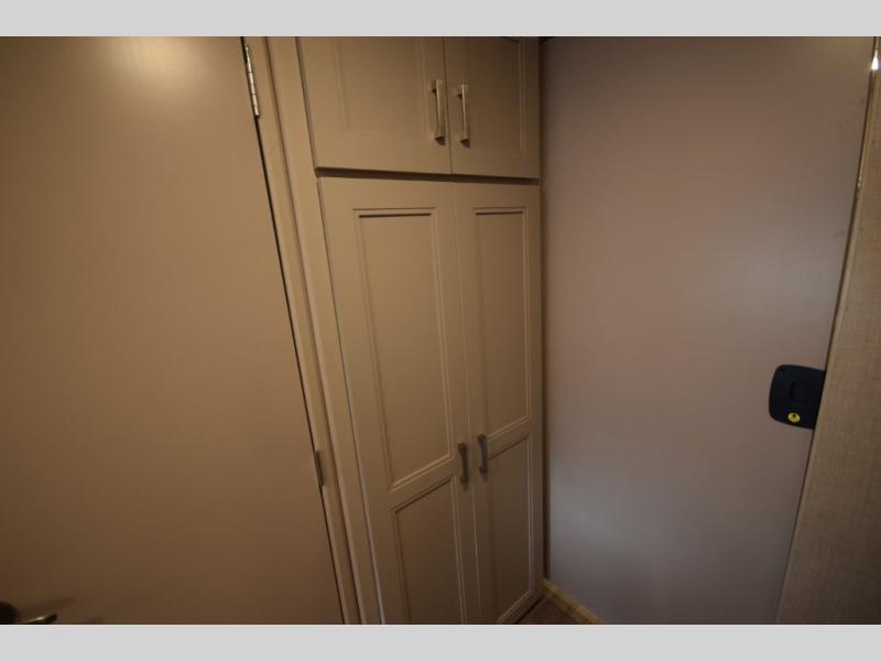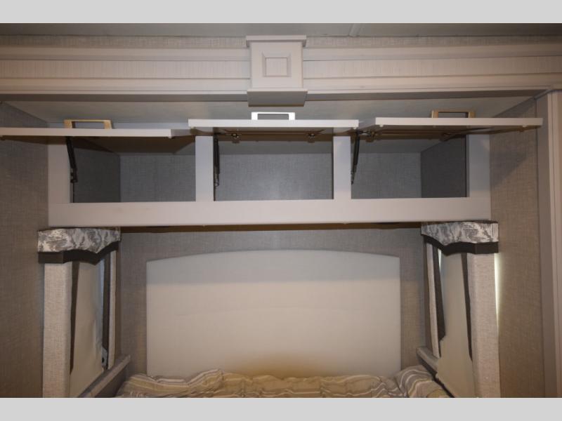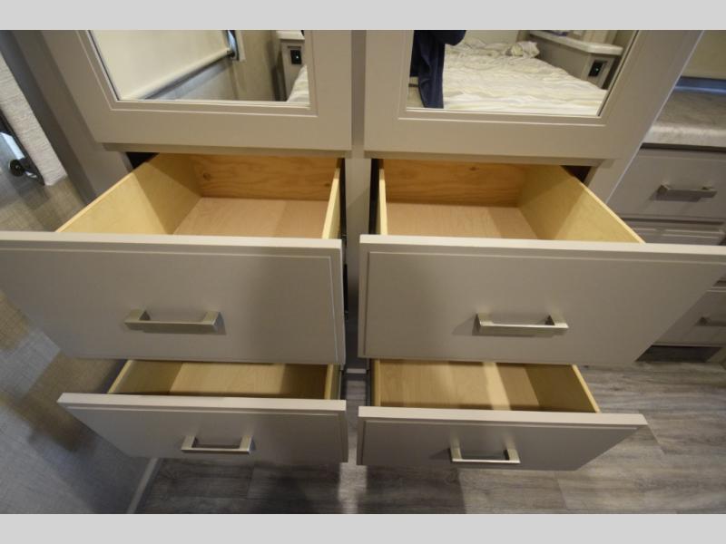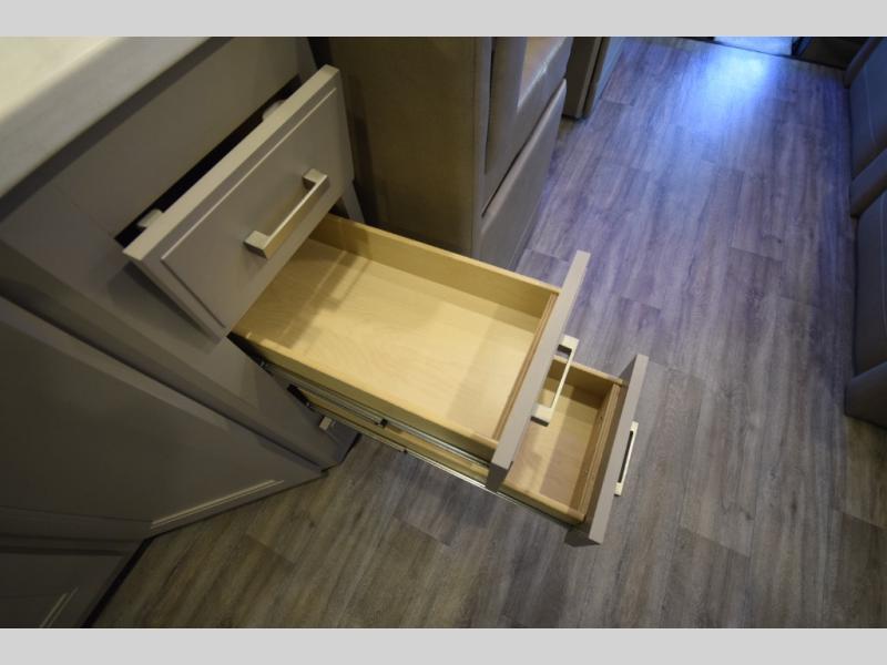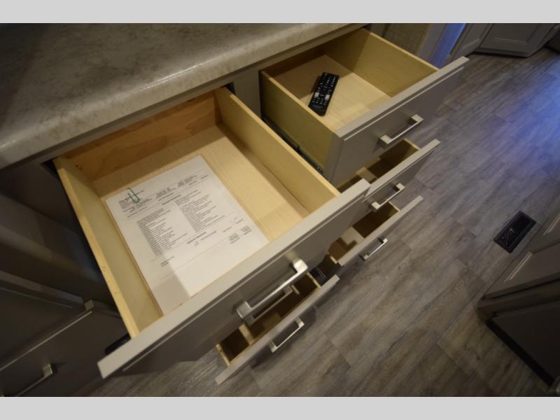 The fully equipped kitchen is ready for any meal on the move, featuring a two-burner gas range, single induction cooktop, and convection microwave oven — plus plenty of storage for your cooking essentials. After a hearty meal, gather around the 70" Dream Dinette or stretch out in the plush theater seating to enjoy a movie on the 39" LED TV.