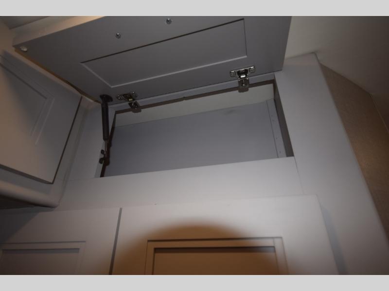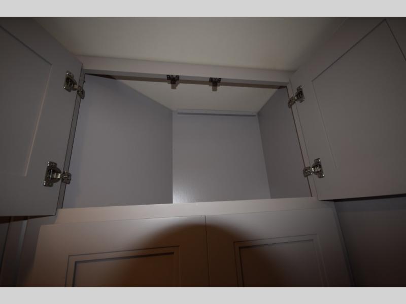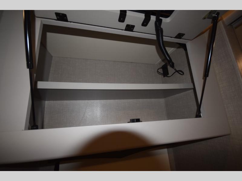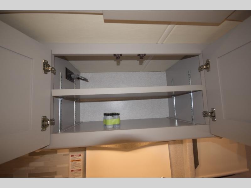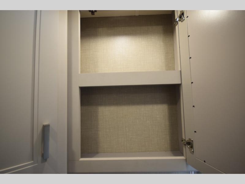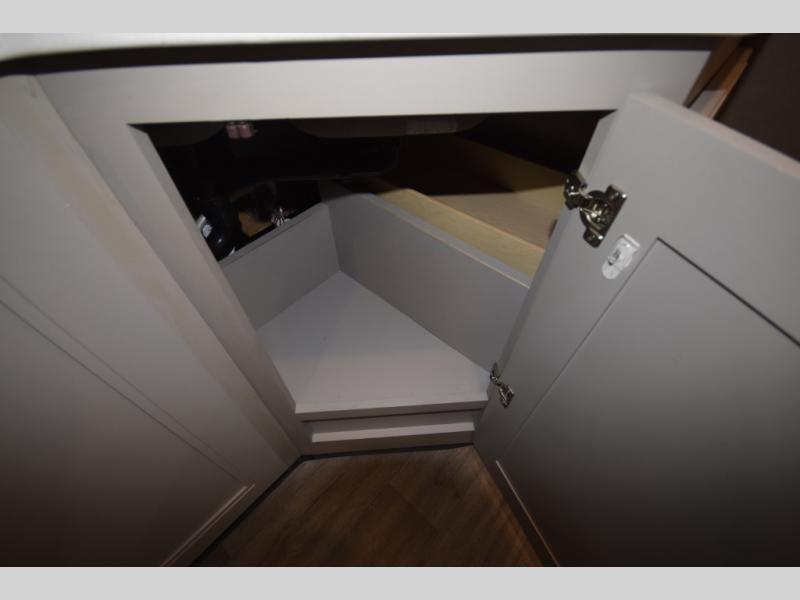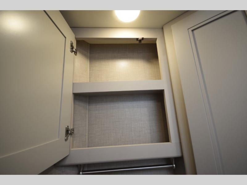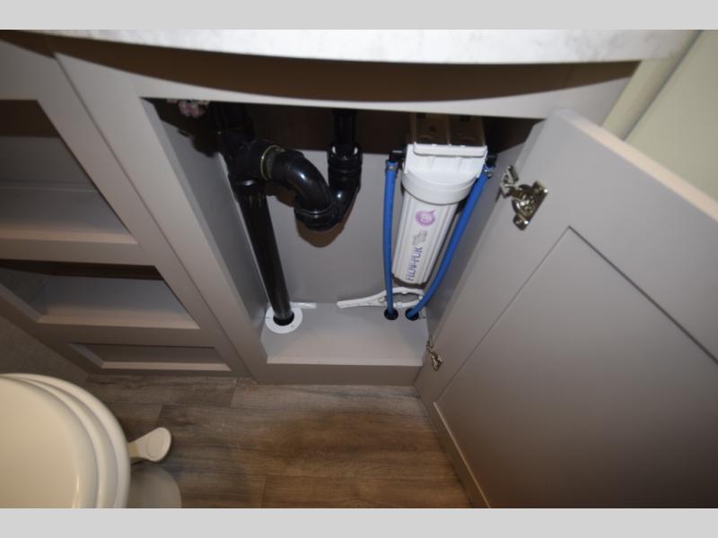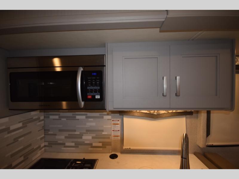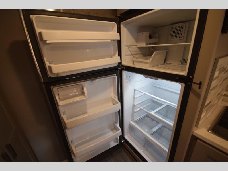 The fully equipped kitchen is ready for any meal on the move, featuring a two-burner gas range, single induction cooktop, and convection microwave oven — plus plenty of storage for your cooking essentials. After a hearty meal, gather around the 70" Dream Dinette or stretch out in the plush theater seating to enjoy a movie on the 39" LED TV.