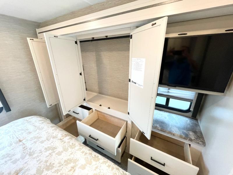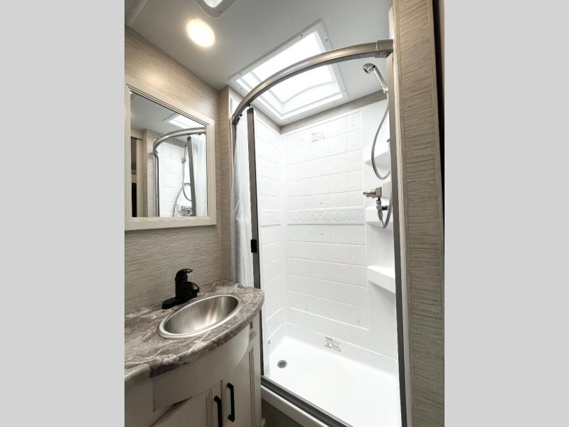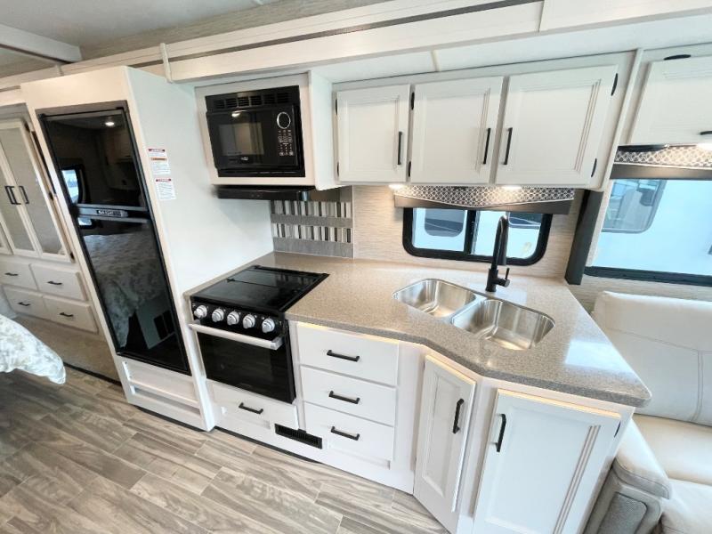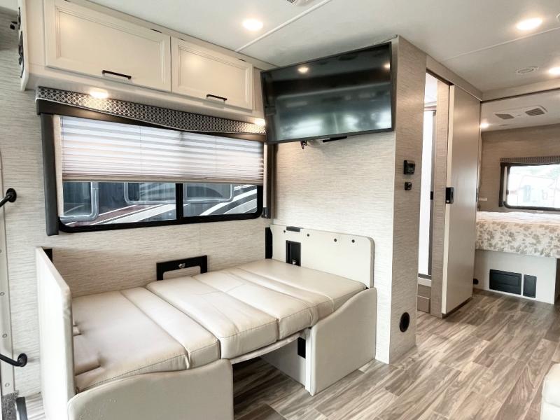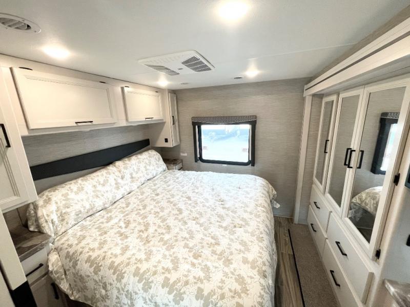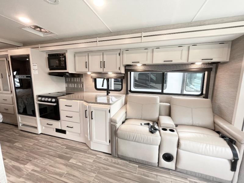 You will love how much space you have in this motorhome thanks to the full-wall slide! There is a jack-knife sofa and a Dream Dinette, or you can choose the optional theater seats in place of the sofa if you don't need the additional sleeping space. The chef of your group can prepare meals indoors on the three burner gas cooktop or in the microwave oven, plus there is an exterior kitchen with a refrigerator, a sink, and a 1000-watt inverter! The full bath will allow you to freshen up each day, and you'll feel right at home in the rear private bedroom with a king bed, a closet, plus a 32" TV!
