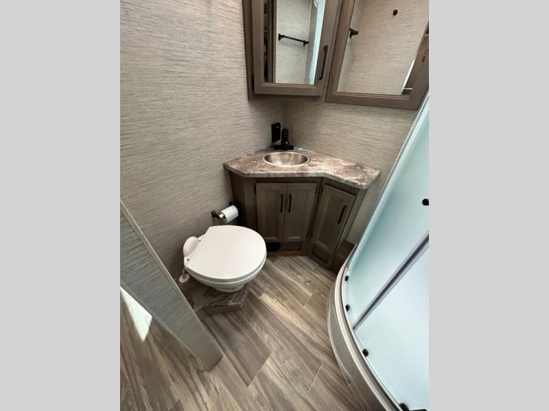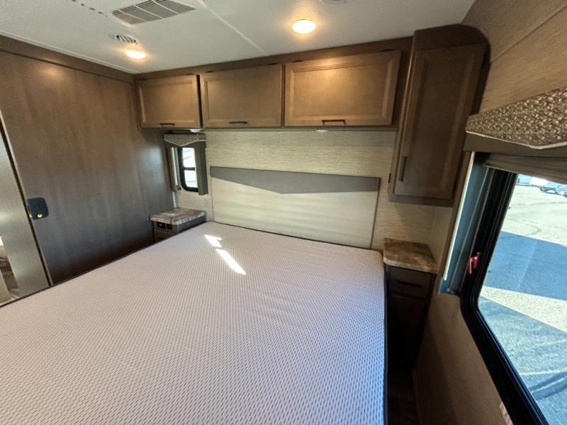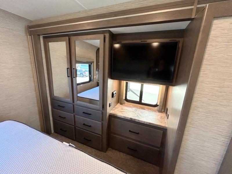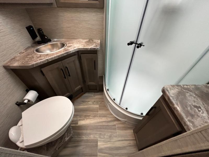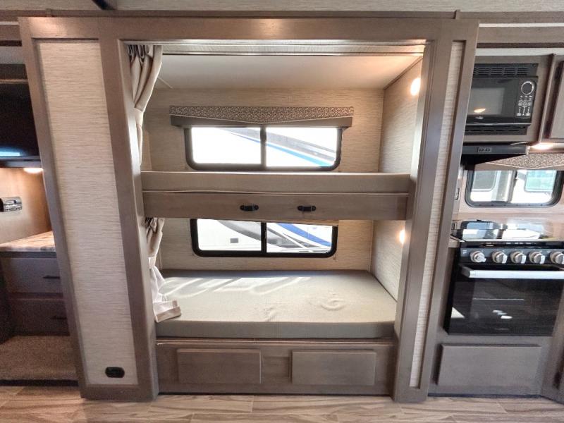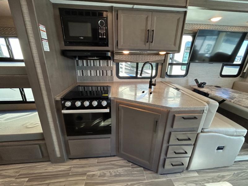 Are you looking for a motorhome with more space and comfort? Your search is over with this family-friendly coach that can sleep eight people each night. The kids will love the bunk beds and the drop-down overhead bunk up front, while you enjoy the king bed in the rear bedroom. There is also a Dream Dinette and a jack-knife sofa across from the 39" TV for easy viewing. Home-cooked meals can be prepared on the three burner gas cooktop or in the microwave oven, and leftovers can go in the double door refrigerator. This model also includes a spacious full bath with a linen closet, a shower skylight, and a sleek glass shower door!