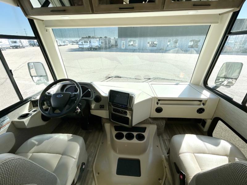 The A.C.E Class A gas motorhome is constructed with a welded tubular steel floor, vacu-bond laminated roof, walls and floor with block foam insulation, and a premium one-piece exterior roof for a coach made to last. You will love the pet-friendly features, like the Bird's Eye window, the Pet-Link multi-purpose tie-down and the Pull-Out Kibble Station with an FDS approved pet bowl liner. Each model includes an Onan RV QG 4,000 gas generator, a Winegard ConnecT Wi-Fi extender +4G, and are pre-wired for solar charging. Some of the other convenient amenities you will find on the A.C.E are frameless windows, a basement pass-through storage, and an exterior LP connection. Head inside to find residential vinyl flooring, pressed laminate countertops, glass tile backsplash in the kitchen, and a designer headboard, bedspread and pillow shams in the bedroom for all-around comfort!