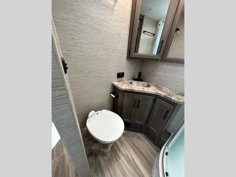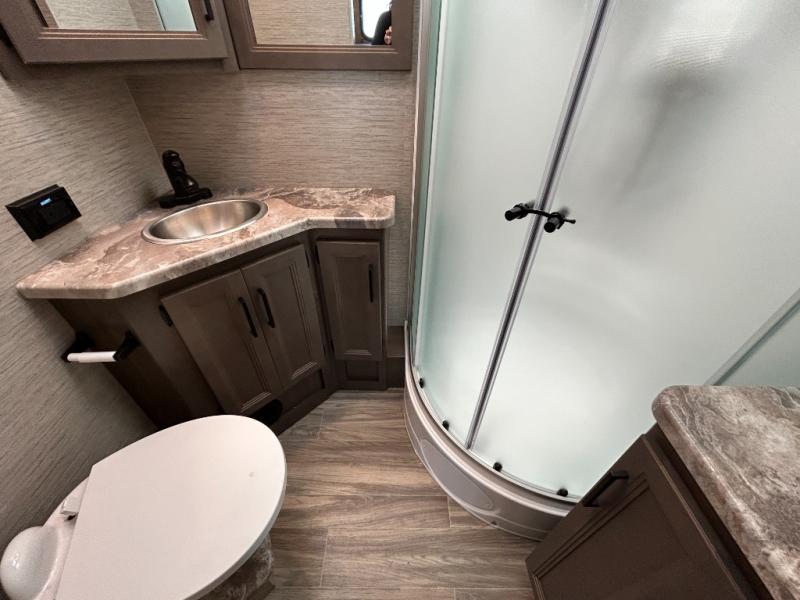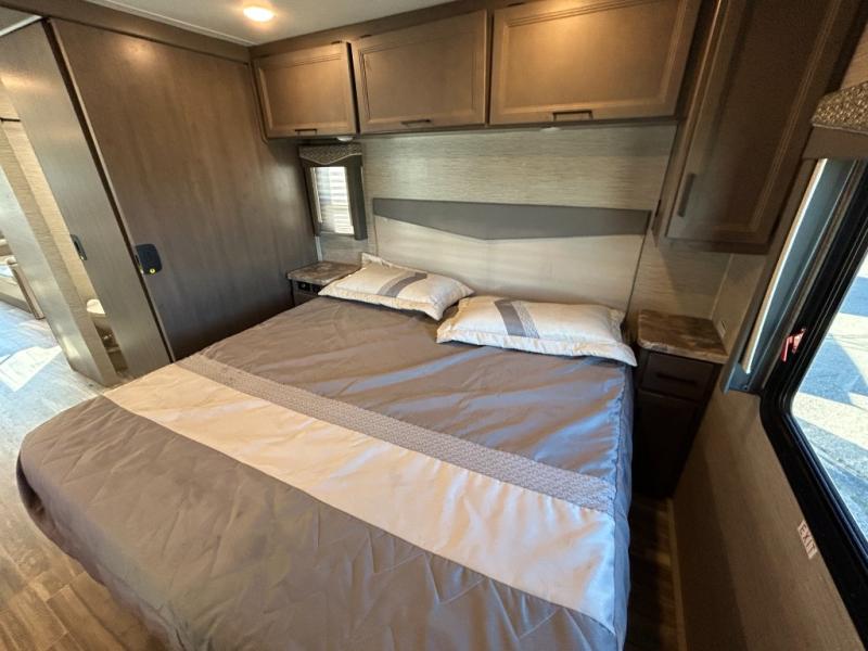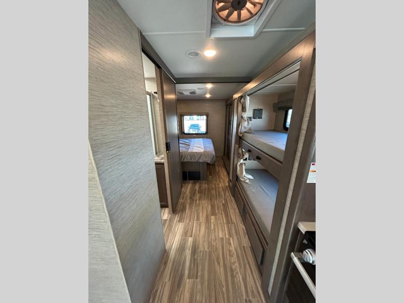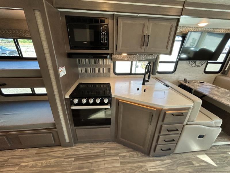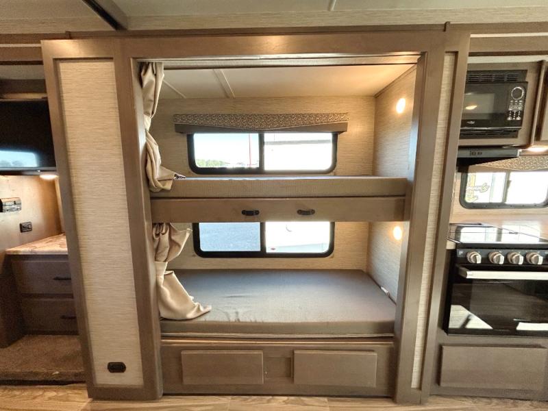 Are you looking for a motorhome with more space and comfort? Your search is over with this family-friendly coach that can sleep eight people each night. The kids will love the bunk beds and the drop-down overhead bunk up front, while you enjoy the king bed in the rear bedroom. There is also a Dream Dinette and a jack-knife sofa across from the 39" TV for easy viewing. Home-cooked meals can be prepared on the three burner gas cooktop or in the microwave oven, and leftovers can go in the double door refrigerator. This model also includes a spacious full bath with a linen closet, a shower skylight, and a sleek glass shower door!