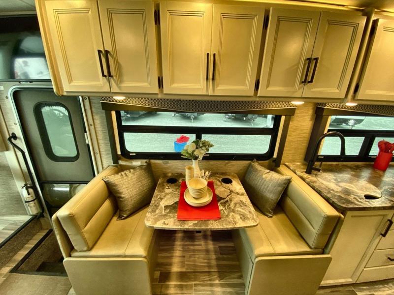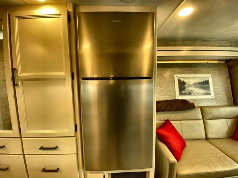 Plan to see it all in this RUV Class A gas coach that can sleep five to six people each night. The sofa slide out includes a removable pedestal table to enjoy your meals at, and there is a 32" TV across from the sofa to watch your favorite shows. You will also find a 32" TV in the rear bedroom, along with twin beds that convert to a king-size bed if you like. The spacious full bath includes a stainless steel sink, a shower skylight, and convenient robe hooks. Breakfast, lunch, and dinner can be made on the two burner gas cooktop or in the convection microwave, and the double door refrigerator can store your perishables for the whole week.