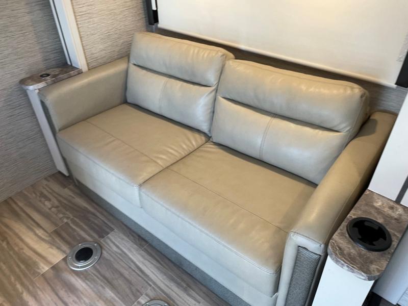 Plan to see it all in this RUV Class A gas coach that can sleep five to six people each night. The sofa slide out includes a removable pedestal table to enjoy your meals at, and there is a 32" TV across from the sofa to watch your favorite shows. You will also find a 32" TV in the rear bedroom, along with twin beds that convert to a king-size bed if you like. The spacious full bath includes a stainless steel sink, a shower skylight, and convenient robe hooks. Breakfast, lunch, and dinner can be made on the two burner gas cooktop or in the convection microwave, and the double door refrigerator can store your perishables for the whole week.