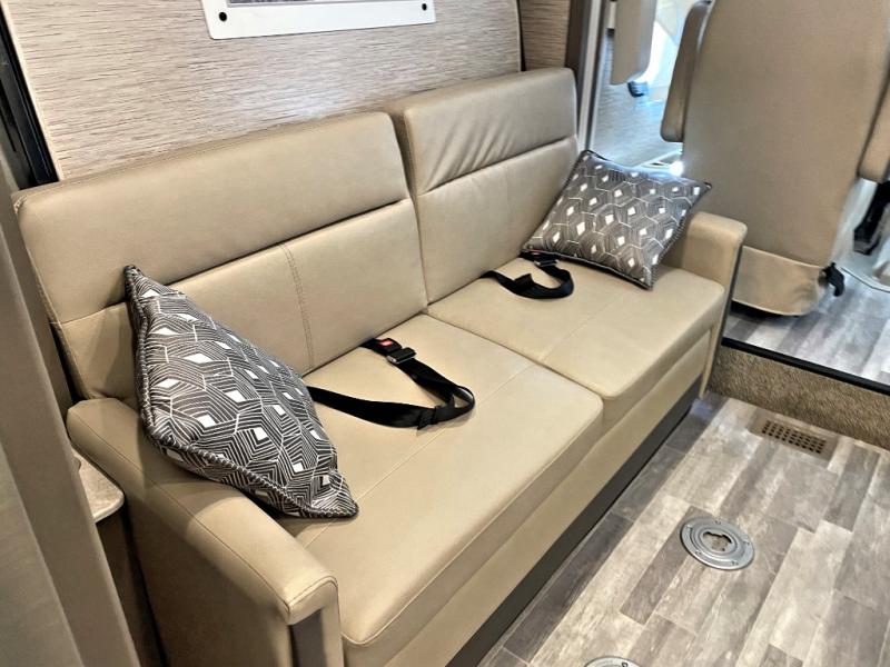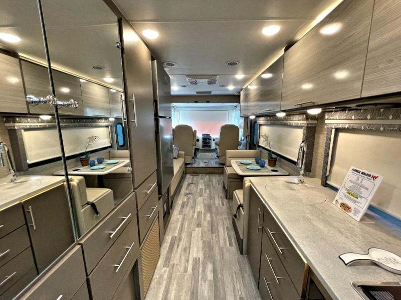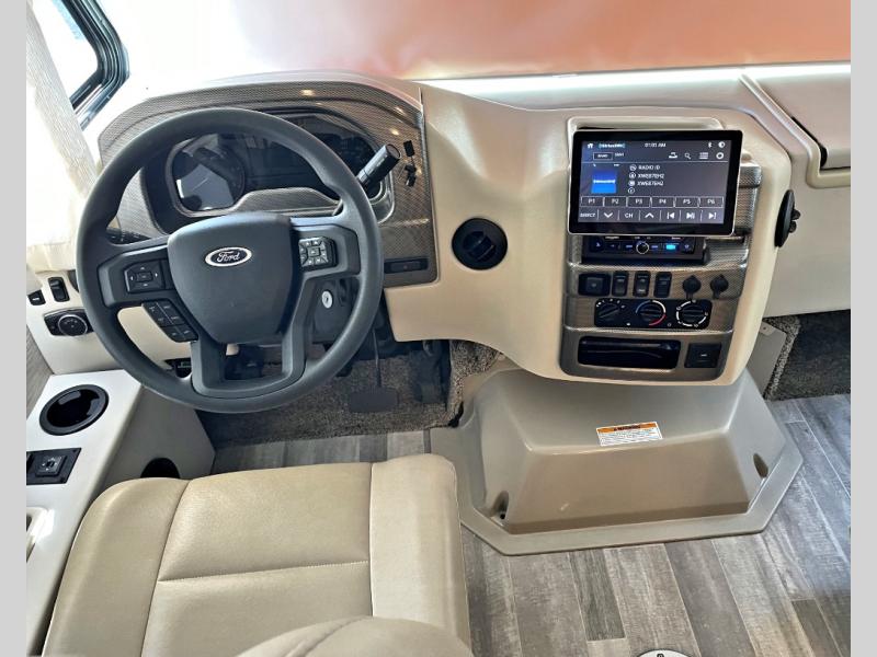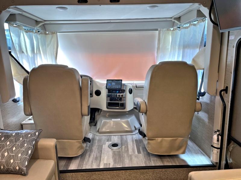 With any Axis RUV Class A gas motorhome by Thor Motor Coach you will enjoy added technology features to make each trip enjoyable, like the RapidCamp+ multiplex lighting and systems control and the Winegard ConnecT 2.0 Wi-Fi/4G/TV antenna. Each model features heated and remote exterior mirrors with integrated side view cameras, reclining and swivel leatherette captain's chairs, and a dash workstation with 110-volt and 12-volt outlets to get some work done if needed. Relaxing after a long day of traveling will be easy with the leatherette furniture, the Euro-style cabinet doors, and 82" interior ceiling height. The HD-MAX exterior with graphics package and black frameless windows provide a sleek look you are sure to love, and don't overlook the power awning with integrated LED lighting and lighted rotocast storage compartments for all your gear.