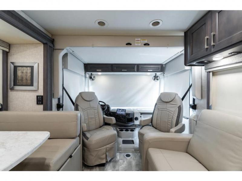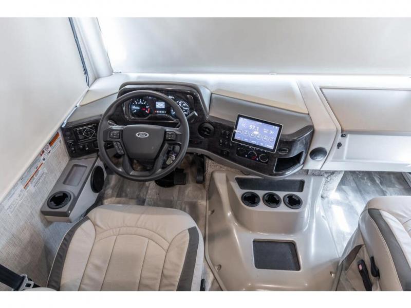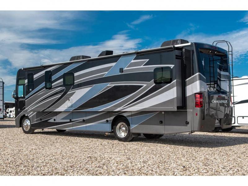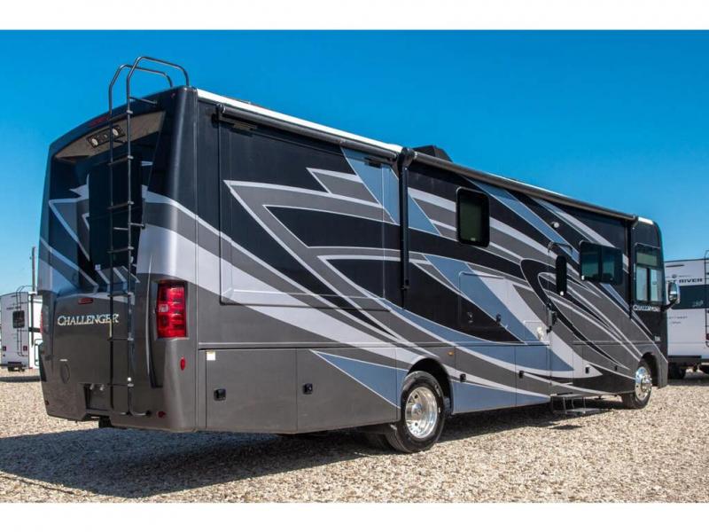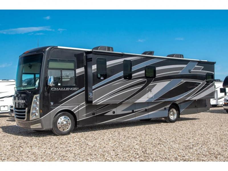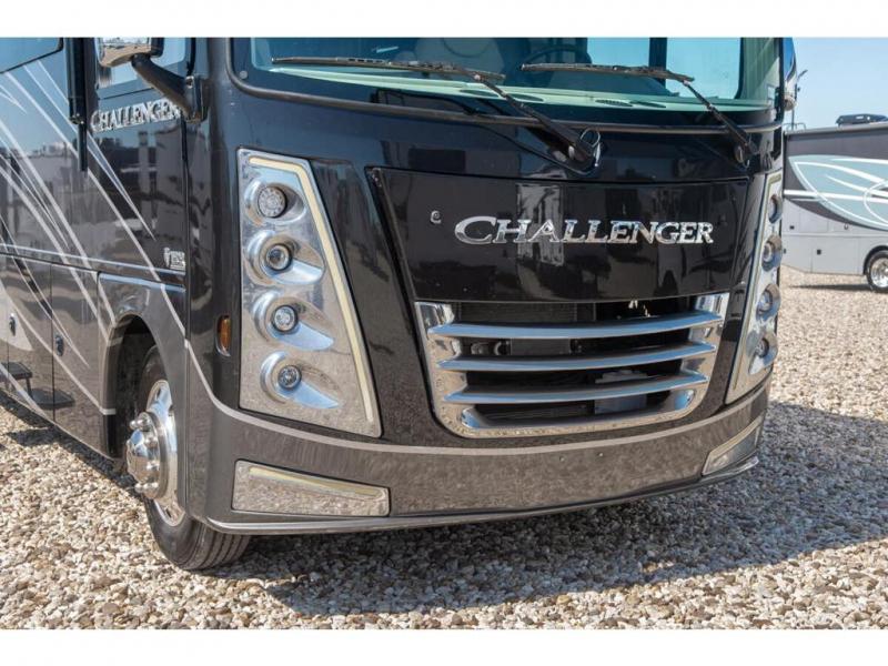 Hop on board the Challenger Class A gas motorhome by Thor Motor Coach for an adventure of a lifetime. The modern dash features a 10.1" touchscreen dash radio with Bluetooth and Sirius/XM radio, plus there are reclining/swivel leatherette captain's chairs for your comfort. Setting up your coach will be a breeze with the automatic leveling jacks with touchpad controls, and each model includes an Onan RV QG 5500 gas generator, dual roof A/C's, and many more amenities for hassle-free camping. The interior of the Challenger will have you feeling at home in a heartbeat. Residential vinyl flooring, solid surface countertops, and satin-finish cabinetry are just a few comforts you will enjoy. Each model also includes a Winegard ConnecT WiFi extender +4G to keep you connected to the outside world as you travel, and an entertainment package that will never leave you bored!