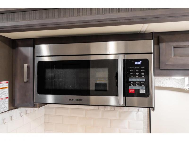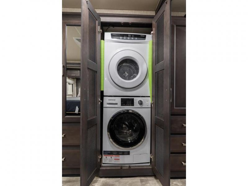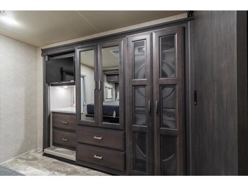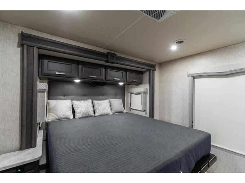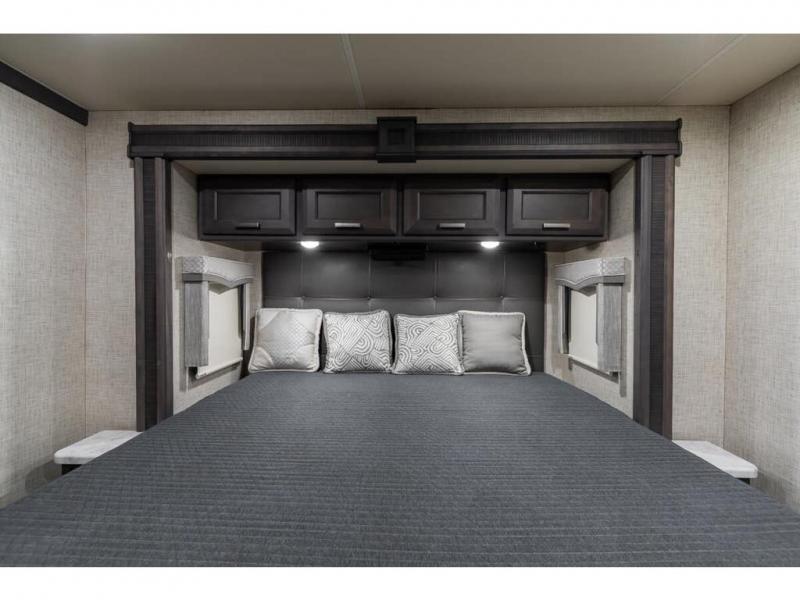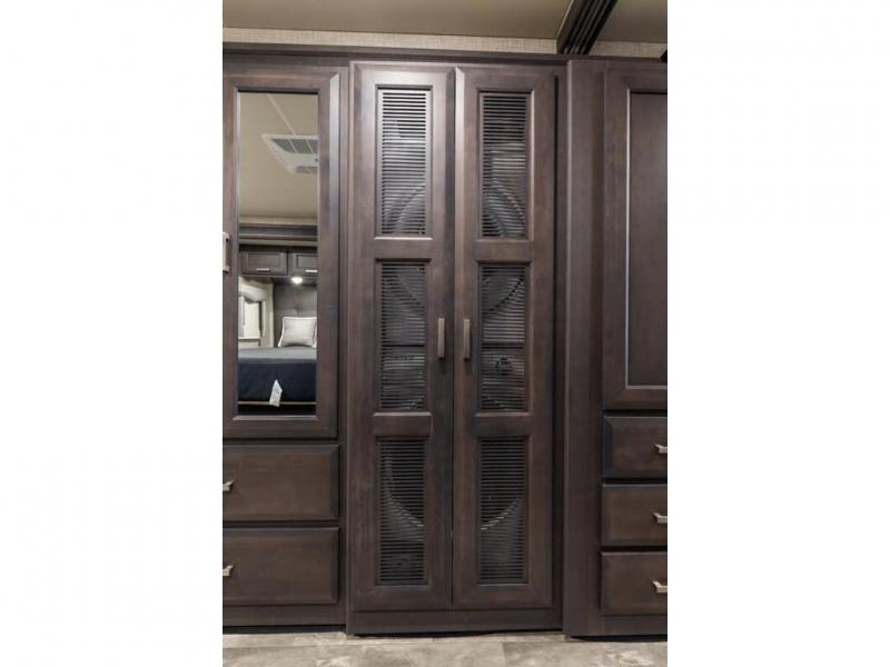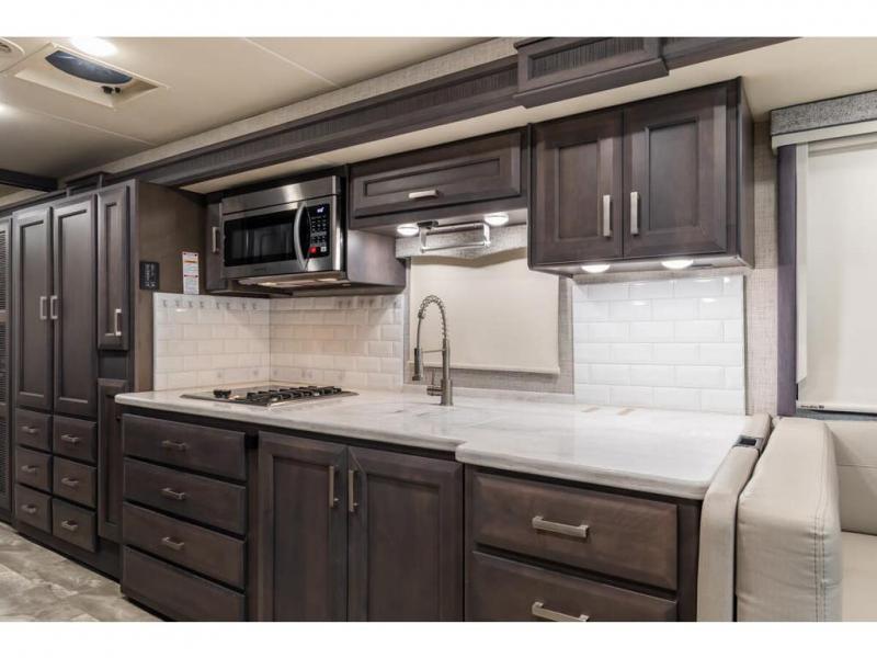 The full-wall slide on this coach means more space to relax, plus there is a second slide out in the rear bedroom that will give you room to get dressed each morning. Breakfast can be made on the two burner gas range, or in the convection microwave. There is a residential refrigerator for perishables, and a pantry for snacks! You will love to visit with friends on the 68" jackknife sofa, dine at the 78" Dream Dinette, and relax under the 20' power awning with LED lighting. This model includes a full bath with a one-piece fiberglass shower and a Shower Miser hot water recycling system you are sure to appreciate. You will get a great night's rest each night on the Tilt-A-View inclining king bed, plus there is a 32" bedroom TV for late-night movies in bed. And your guests can sleep on the drop-down overhead bunk or on the furniture in the main living room, allowing you to sleep seven people each night!