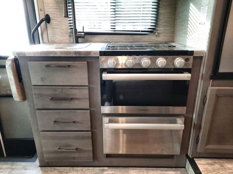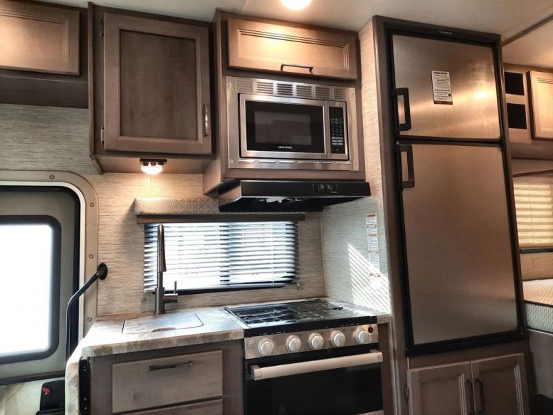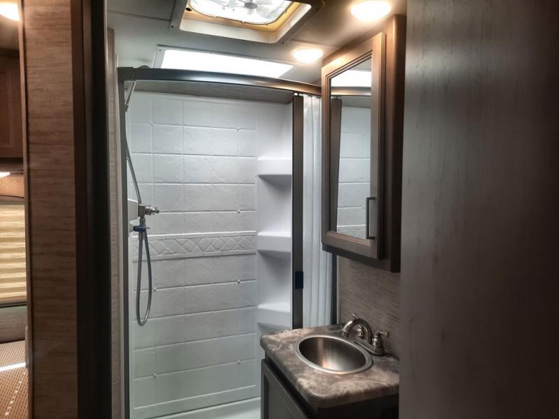 If you wish to escape the hustle and bustle of everyday life with your favorite people then check out this motorhome! Everyone will have a comfortable place to sleep between the rear corner 54" x 80" queen bed, the 52" x 96" bunk over cab with a 40" TV on a swivel for entertainment at night, and even the 76" Dream Dinette can transform into an extra sleeping space. Store all of your essentials in the closet just outside the rear corner bathroom which has a 24" x 36" shower and keep your perishables fresh in the refrigerator. The flip-up countertop extension makes it easier to prepare your home cooked meals, and you can add an optional exterior 32" TV to watch the big game outdoors!