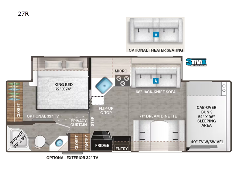 Enjoy a home on wheels with this motorhome! The private bedroom has a 72" x 74" king bed slide for you to get a good night's rest each night, a closet for your clothes, an optional 32" TV, and a privacy curtain to draw. It is conveniently next to the rear corner bathroom too which has a 30" x 36" radius shower with a skylight above for more natural lighting. You can prepare a delicious home cooked meal with the flip-up countertop extension and three burner cooktop then enjoy it at the 71" Dream Dinette. The 68" jackknife sofa offers a comfortable place to take an afternoon nap or you can switch it out for the optional theater seating instead. If you need more sleeping spaces then you will appreciate the 52" x 96" bunk over cab with a 40" TV on a swivel!