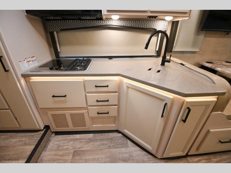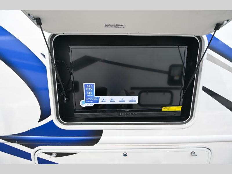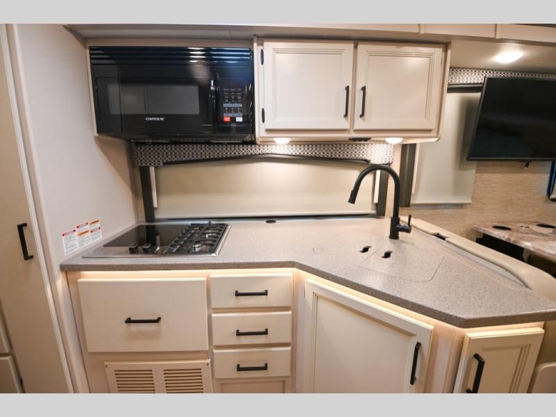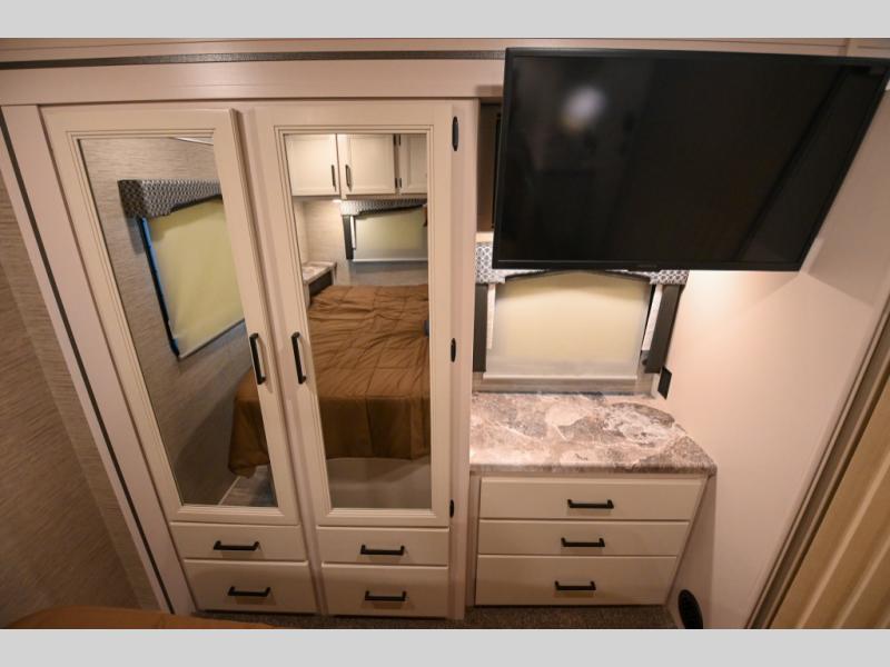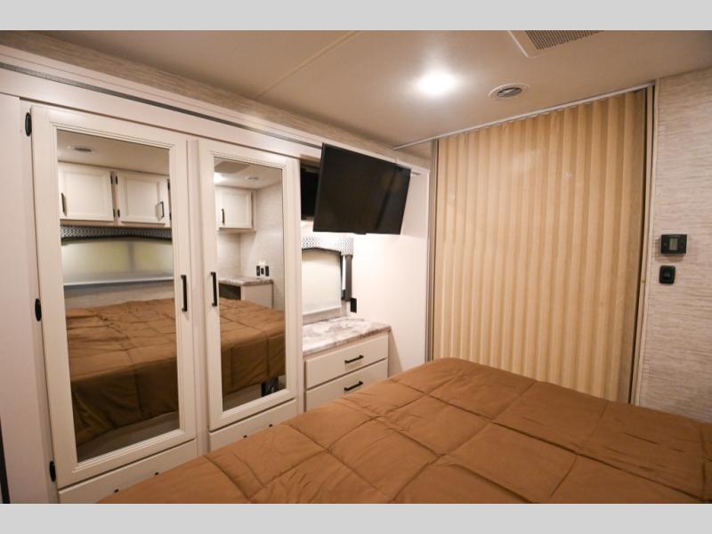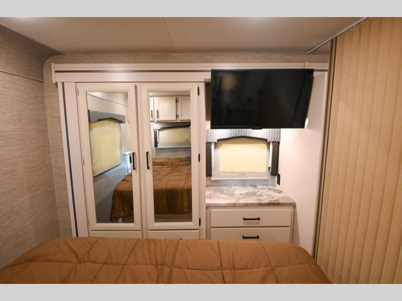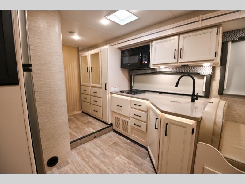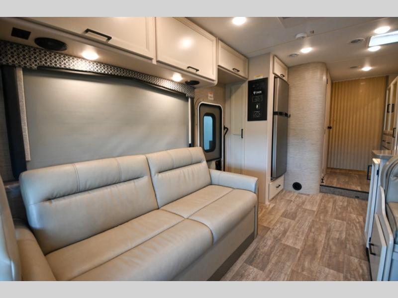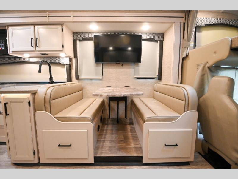 Make your dreams come true with this motorhome! Enjoy at home comforts like a rear private bedroom with a 60" x 75" queen bed, a closet, a dresser, and a 32" TV. There is also a 40" TV above the 71" Dream Dinette and an optional exterior 32" TV for even more entertainment. Freshen up each morning in the full bathroom with the 32" x 32" radius shower with a skylight for added natural lighting then fill your bellies with some yummy bacon cooked on the two burner cooktop. Next to the kitchen pantry is a large closet for your storage needs. Relax in true comfort at night on the 68" jackknife sofa or the optional theater seating if you chose to switch it out for that instead!