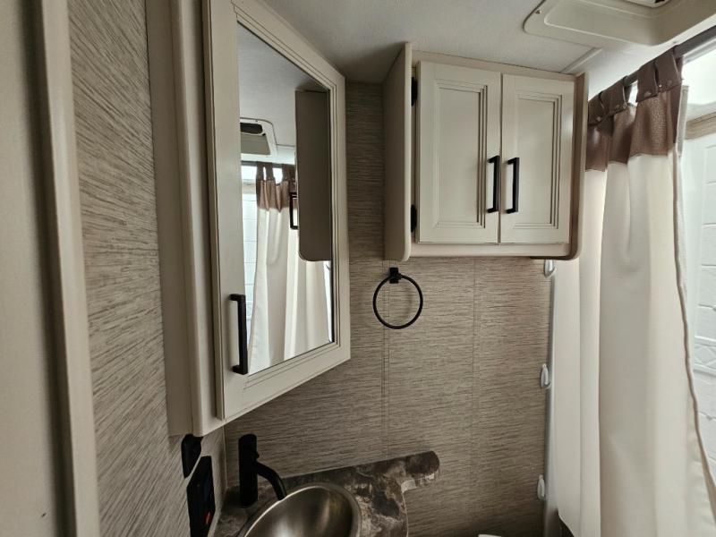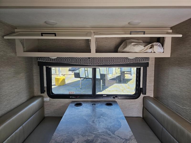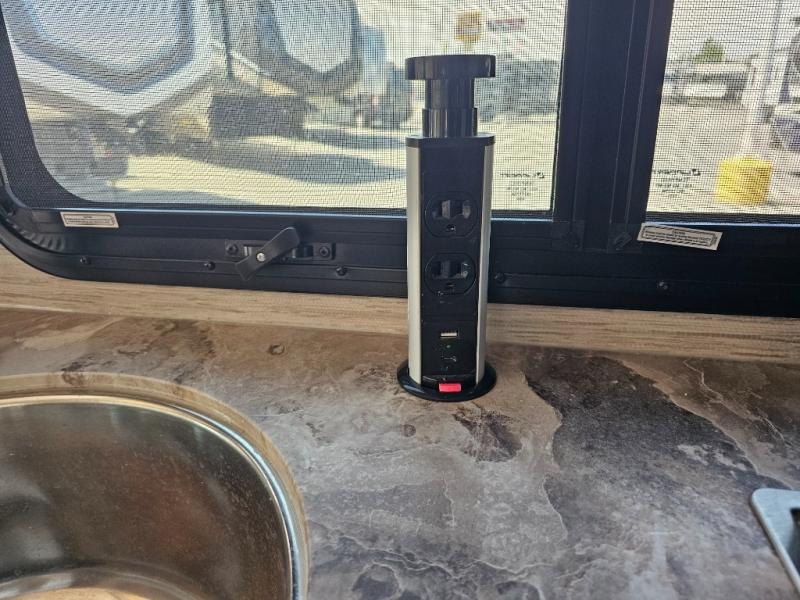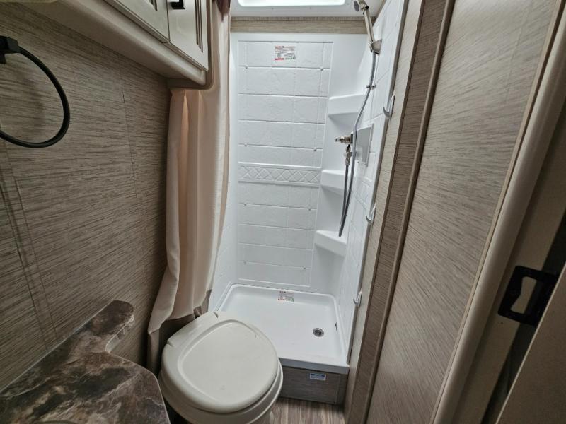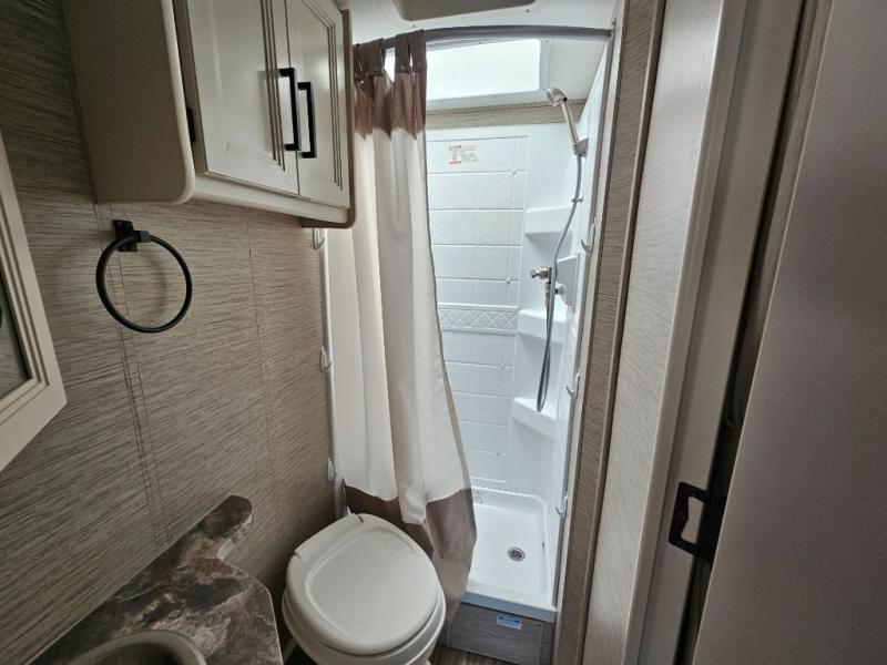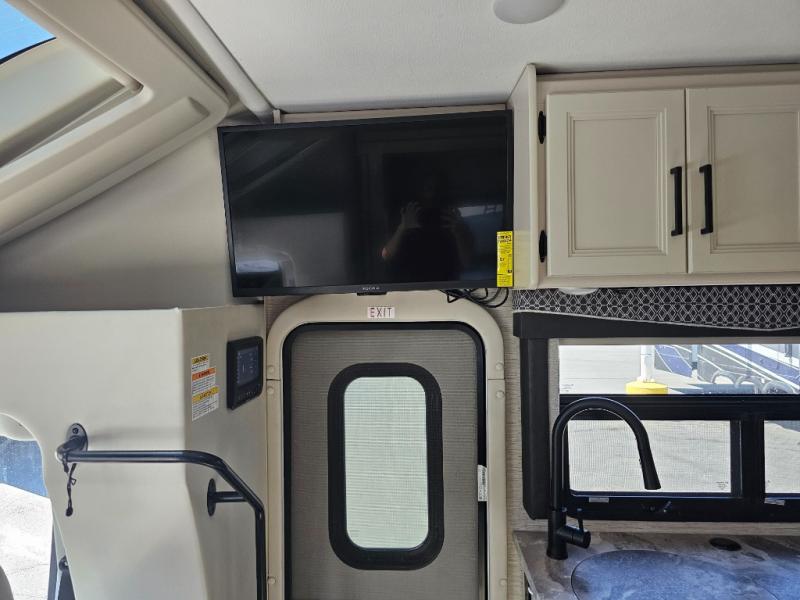 You can tour a local winery or trek up north to find a cozy and secluded camping spot with this Compass AWD Class B+ gas motorhome! All of your needs will be met with the excellent features and amenities included on this coach, like the full bathroom complete with a 24" x 32" shower, three robe hooks, a shower skylight, a foot-flush toilet, and a power bath vent. The kitchen is ready to help you make mobile meals, and the 68" Dream Dinette is the perfect place for eating those meals or playing a game later on. At the dinette table top, you'll find a wireless phone charger with USB plug so that you can charge your phones. There is a privacy curtain that sections off the flip-up RV queen bed, and you'll also find a 32" TV in the bedroom. The second 32" TV is located out in the main living area for everyone else to watch.