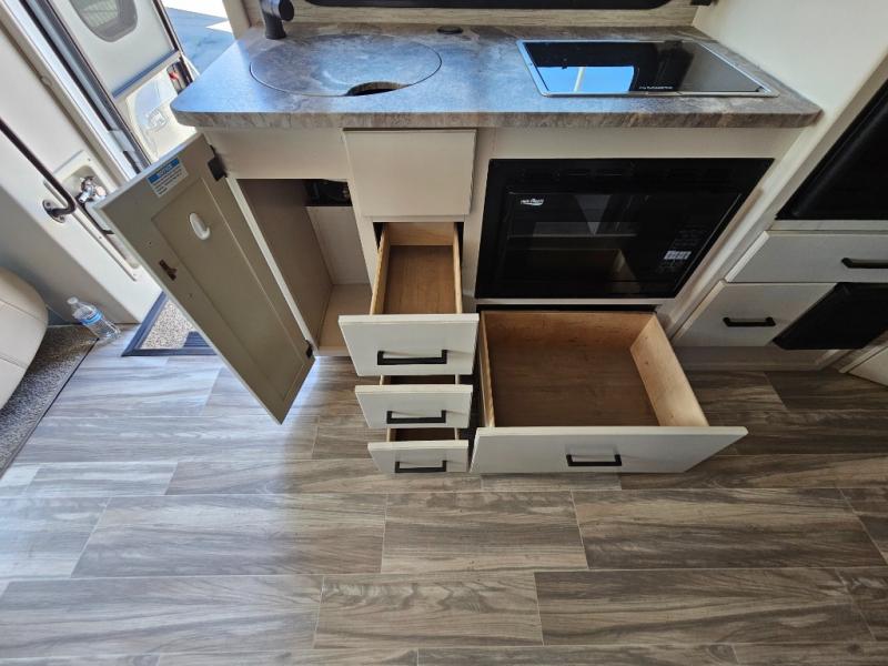 The Thor Motor Coach Compass AWD Class B+ gas motorhome is small but mighty! It includes all-wheel drive, and it is built upon a Ford Transit chassis, 3.5L V6 Eco Boost turbo gas engine, and Ford ten-speed automatic overdrive transmission. The Ford safety features provide excellent care while driving, and you can stay connected to your Compass AWD with the FordPass Connect. The power patio awning with LED lights can be moved out into position with just one touch on your cell phone thanks to the Rapid Camp+ multiplex control system. You will have a 100W solar panel with controller, a single roof air conditioner, a Winegard ConnecT 2.0 Wi-Fi/4G/TV antenna, and a tankless water heater as some of the top electrical and plumbing features.