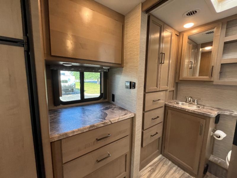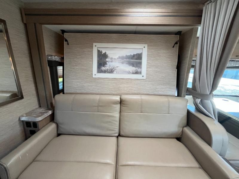 Its time to enjoy life and venture to see new places, enjoy events and visit with friends in your state or even further! You will love having a living area as well as a bedroom with the versatility of the Murphy bed and sofa combination. And the curtain allows you privacy when you have overnight guests sleeping on the dream dinette and the cab over bunk. You might like to add the 32" TV option across from the sofa if the 39" TV with swivel in the cab area isn't enough. There are full kitchen amenities for the cook including a double door refrigerator and a pantry to store all the goodies. And the sliding door into the rear full bathroom saves even more space for you to enjoy getting cleaned up and/or ready for bed or the next adventure.
