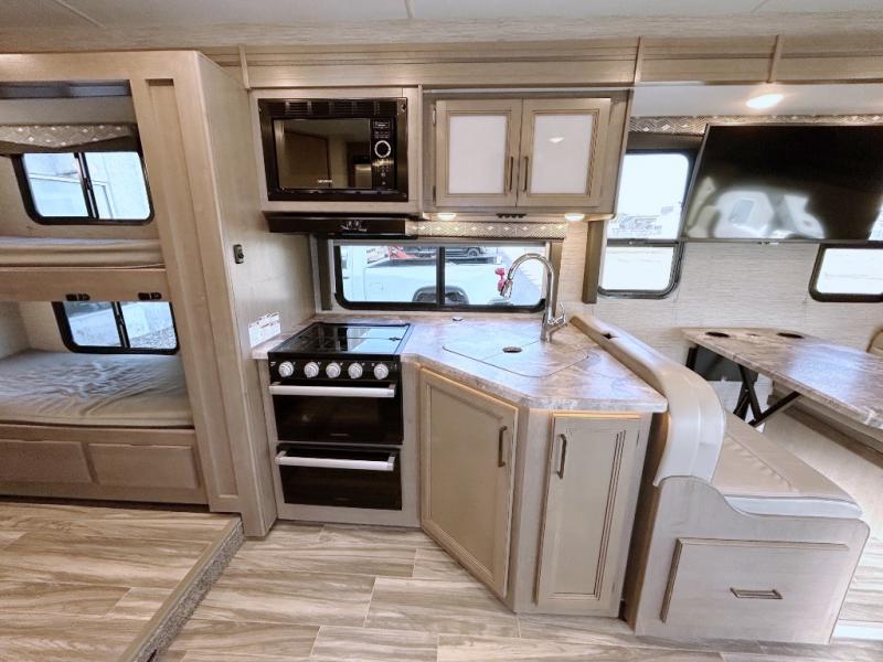 Planning a family vacation, a friend get-away or enjoy traveling with your partner? This coach offers a spacious interior thanks to the full-wall slide that stretches from behind the cab seats to the rear private bedroom. You can rest easy in your own queen bed with access to the double entry bathroom, your kids or guests will enjoy the bunk beds and cab over bunk to sleep on, plus the dream dinette and 68" jack-knife sofa offer even more sleeping space. And the kitchen amenities will impress anyone as they enter the mid-coach entrance. Everyone can watch the 39" TV over the cab that includes a swivel for the perfect view while visiting inside, or head outside to relax under the power awning with integrated LED lighting.