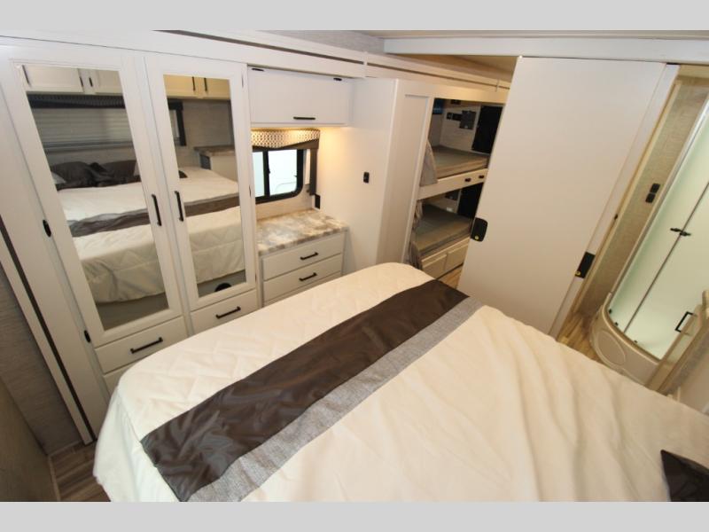 Planning a family vacation, a friend get-away or enjoy traveling with your partner? This coach offers a spacious interior thanks to the full-wall slide that stretches from behind the cab seats to the rear private bedroom. You can rest easy in your own queen bed with access to the double entry bathroom, your kids or guests will enjoy the bunk beds and cab over bunk to sleep on, plus the dream dinette and 68" jack-knife sofa offer even more sleeping space. And the kitchen amenities will impress anyone as they enter the mid-coach entrance. Everyone can watch the 40" TV over the cab that includes a swivel for the perfect view while visiting inside, or head outside to relax under the power awning with integrated LED lighting.