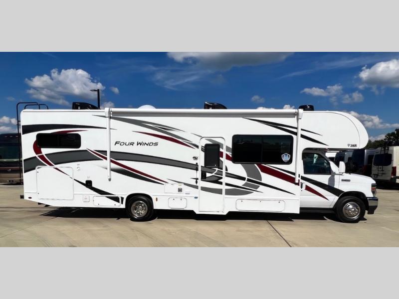 With any Four Winds Class C gas motorhome, you can travel in a trustworthy Ford E-Series chassis with 350HP. Each is built with welded sidewall cage construction and a welded tubular aluminum roof, a one-piece fiberglass cap, and includes a slick fiberglass exterior with graphics package for style and years of enjoyment on the open road. Inside, you will enjoy the well-equipped kitchen, the spacious bathroom, the sleeping accommodations and the Winegard ConnecT 2.0 WiFi/4G/TV antenna that allows you to stay connected. With several floorplans to choose from and options to add, you will surely find one that fits your family's needs or your friend's approval. Choose today!
