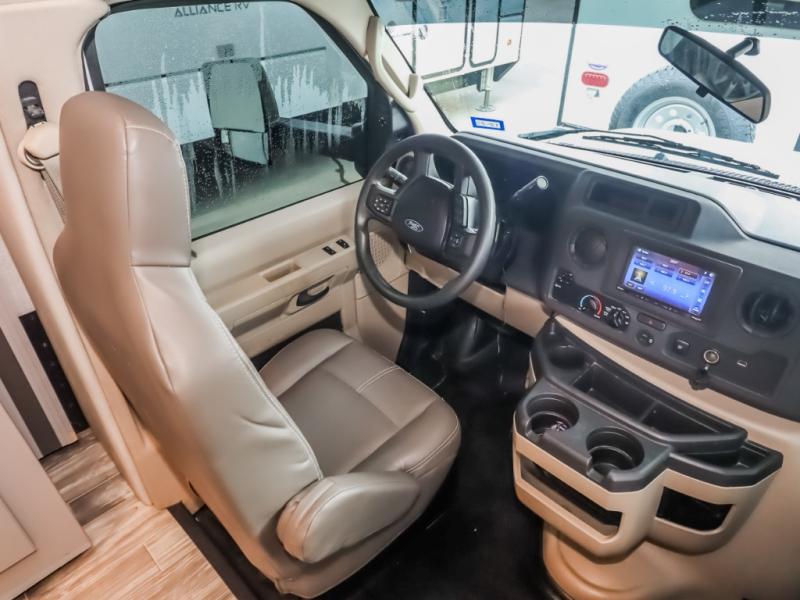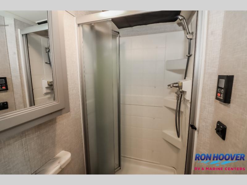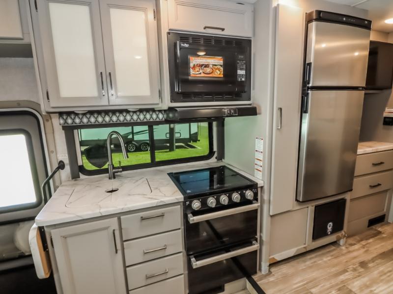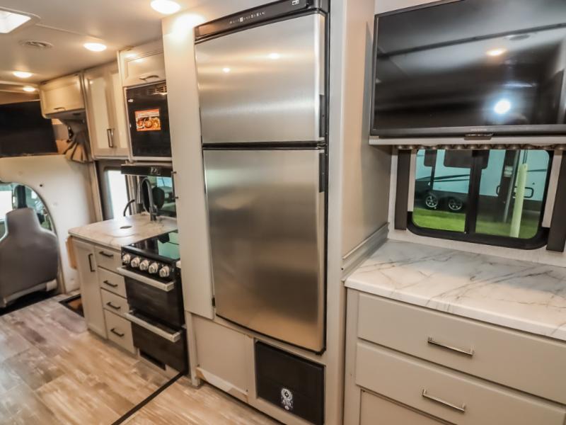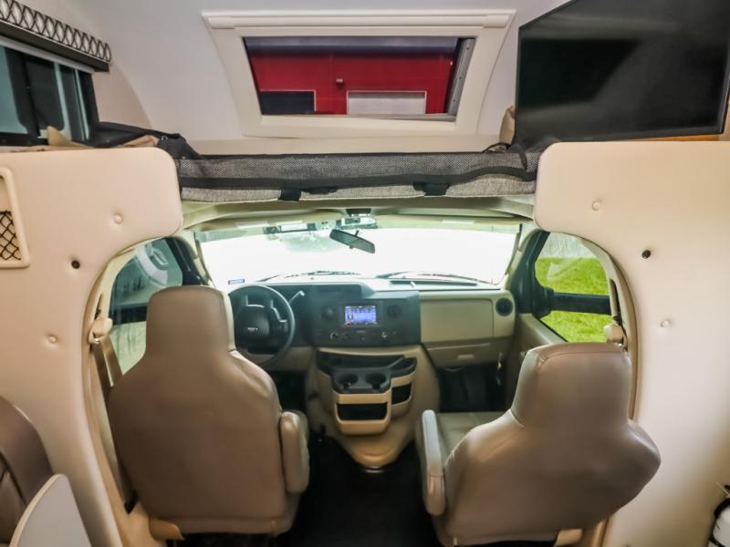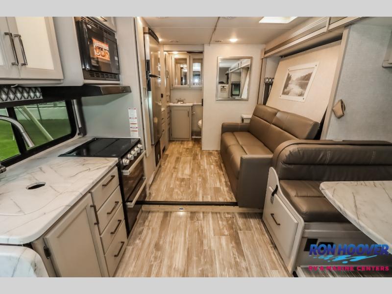 With any Geneva Class C gas motorhome by Thor Motor Coach, the interior offers coastline gray flat panel cabinet doors with glacier decor and decorative glass inserts in the kitchen overhead cabinet doors for style, pressed laminated countertops for durability and easy care, and leatherette furniture for comfort, plus conveniences such as a waste basket in the kitchen, a wall cubby with net and USB charging port, and a Showermiser hot water recycling system. The fiberglass front cap with skylight and power shade is a popular feature since it provides natural lighting and beautiful views out of the front, the lighted rotocast storage compartments have a single on/off interior switch allowing you to store items safely during the day or night, the Pet-Link multi-purpose tie down is an added safety feature, plus there are many more standout features. And depending on the coach you choose, there is solar prep or a solar charging system.