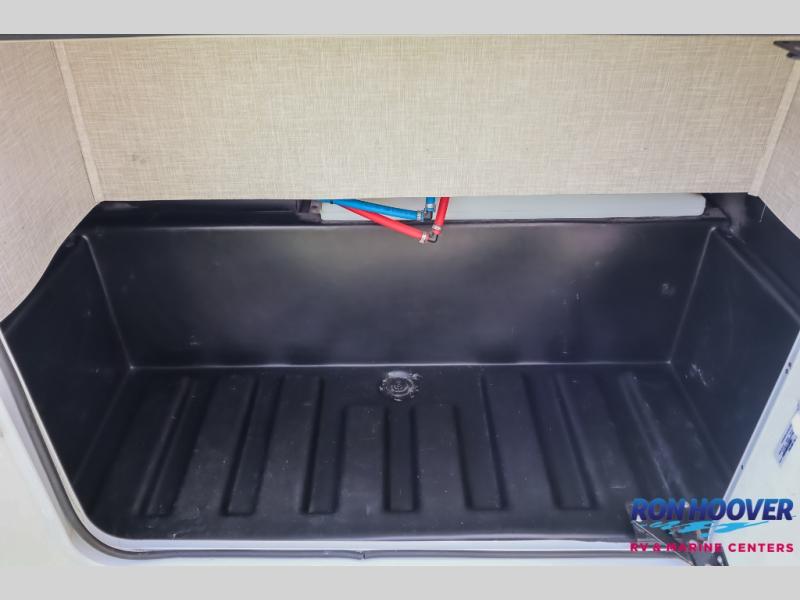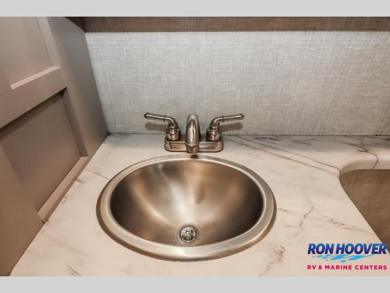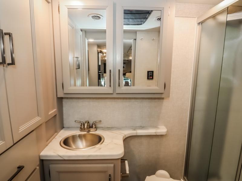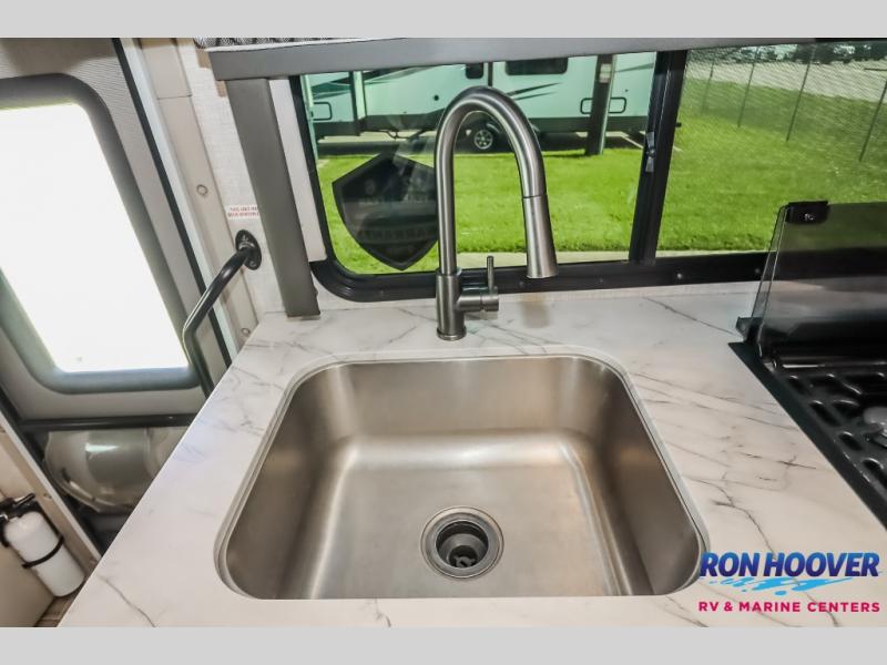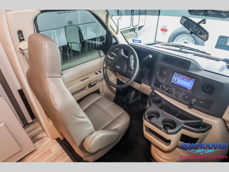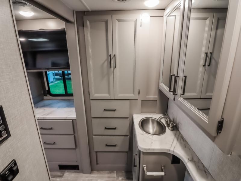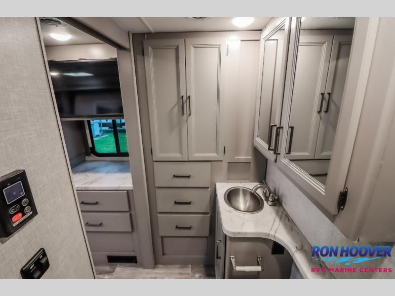 With any Geneva Class C gas motorhome by Thor Motor Coach, the interior offers coastline gray flat panel cabinet doors with glacier decor and decorative glass inserts in the kitchen overhead cabinet doors for style, pressed laminated countertops for durability and easy care, and leatherette furniture for comfort, plus conveniences such as a waste basket in the kitchen, a wall cubby with net and USB charging port, and a Showermiser hot water recycling system. The fiberglass front cap with skylight and power shade is a popular feature since it provides natural lighting and beautiful views out of the front, the lighted rotocast storage compartments have a single on/off interior switch allowing you to store items safely during the day or night, the Pet-Link multi-purpose tie down is an added safety feature, plus there are many more standout features. And depending on the coach you choose, there is solar prep or a solar charging system.