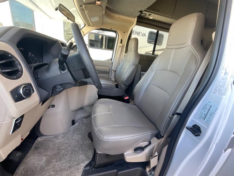 With any Geneva Class C gas motorhome by Thor Motor Coach, the interior offers coastline gray flat panel cabinet doors with glacier decor and decorative glass inserts in the kitchen overhead cabinet doors for style, pressed laminated countertops for durability and easy care, and leatherette furniture for comfort, plus conveniences such as a waste basket in the kitchen, a wall cubby with net and USB charging port, and a Showermiser hot water recycling system. The fiberglass front cap with skylight and power shade is a popular feature since it provides natural lighting and beautiful views out of the front, the lighted rotocast storage compartments have a single on/off interior switch allowing you to store items safely during the day or night, the Pet-Link multi-purpose tie down is an added safety feature, plus there are many more standout features. And depending on the coach you choose, there is solar prep or a solar charging system.