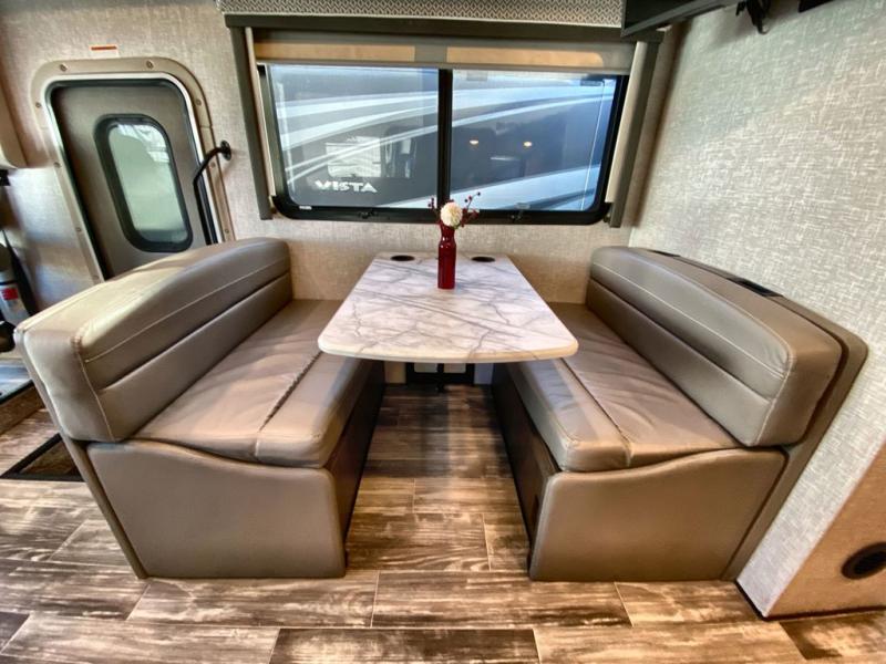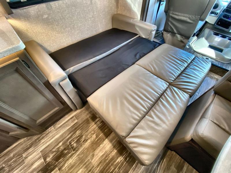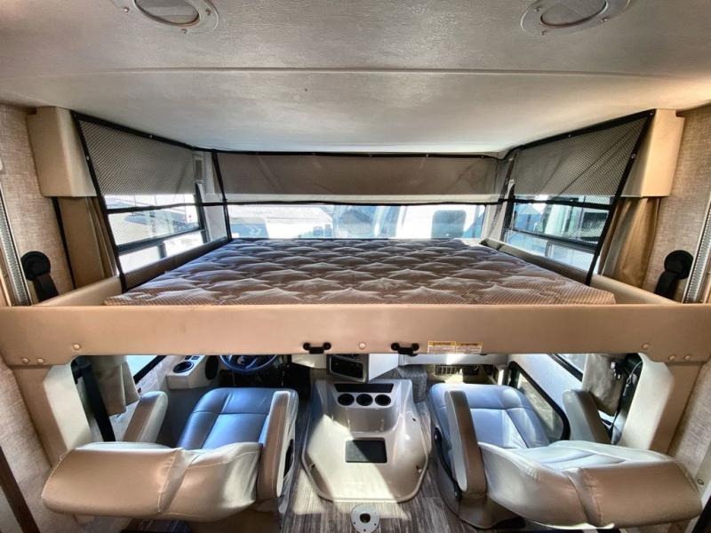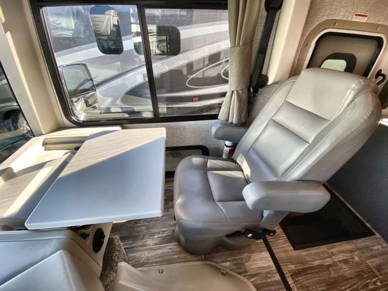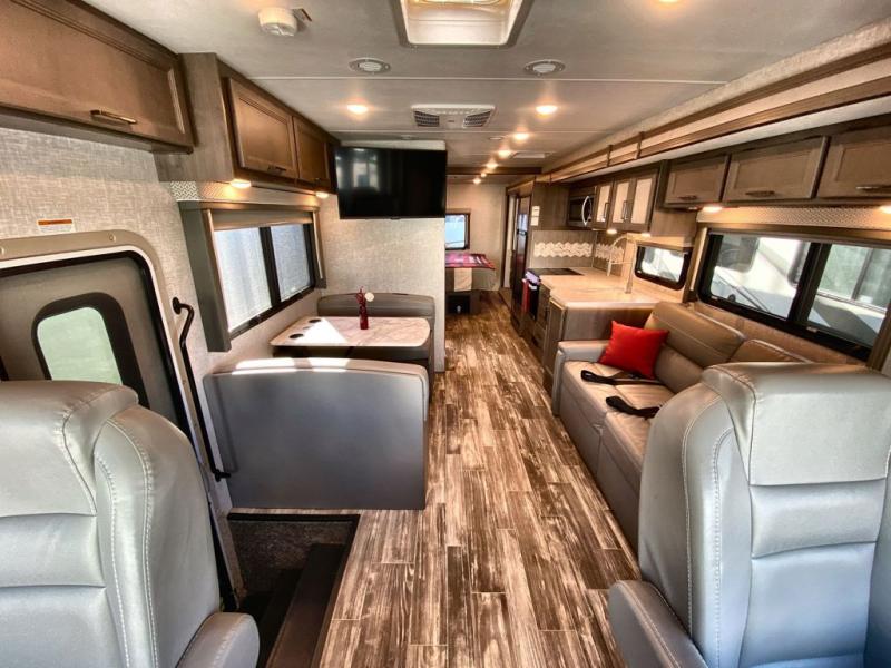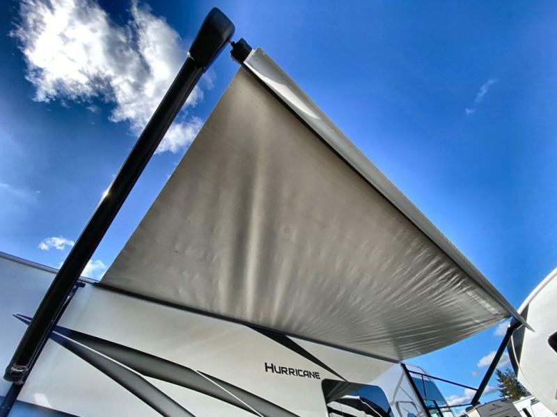 With any Hurricane Class A gas motorhome by Thor Motor Coach you will appreciate solid construction materials, like the welded tubular steel floor and the Vacu-Bond laminated roof, walls, and floor with block foam insulation. Each model sits on a Ford F-53 chassis with a 7.3L Triton V8 engine for power you can feel, plus there is an 8,000 lb. trailer hitch with a 7-pin round connector to pull your car along. The Rapid Camp+ multiplex system with Bluetooth will allow you to easily set up camp from the convenient 7" touchscreen provided, and the Winegard ConnecT WiFi extender +4G will let you catch up on work if needed. The Hurricane includes pressed laminated countertops inside, as well as residential vinyl flooring, decorative glass and tile backsplash in the kitchen, and many more at-home comforts.