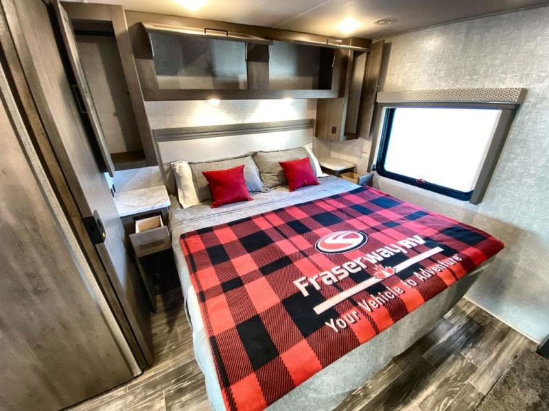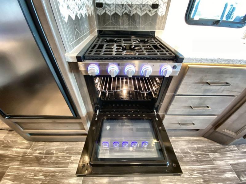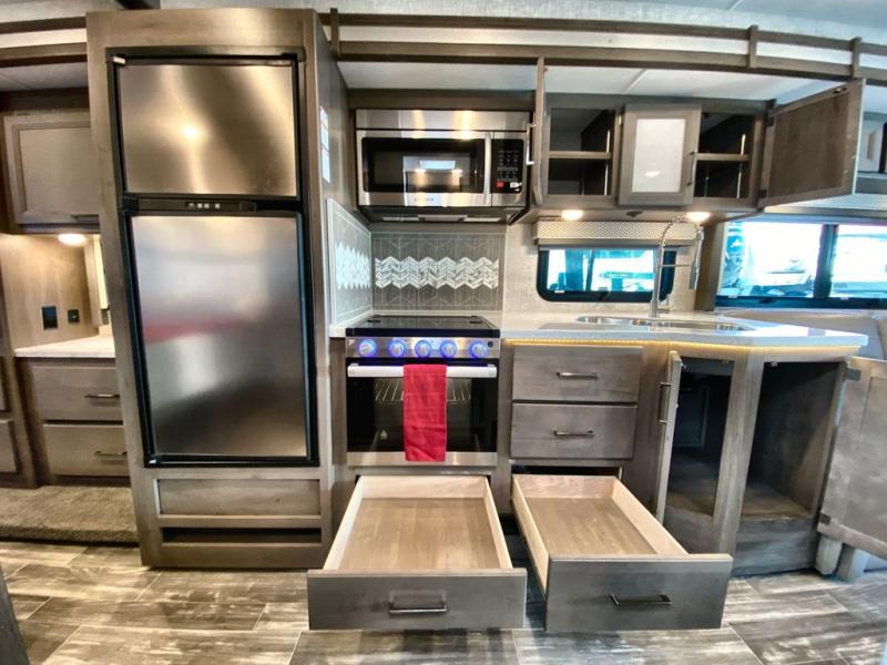 Family trips across the country are made complete in this spacious coach! The swivel captain's chairs can become a part of the living area once you park, and your guests can relax on the Dream Dinette or sofa bed. Lunch can be made on the three burner gas cooktop, or in the 30" over-the-range microwave oven, and clean up will be a breeze in the large double bowl stainless steel sink. This model also includes an outdoor kitchen with a refrigerator and a sink to store cold drinks and clean up before dinner. You will love having your own bedroom to retreat to each night, and here you'll find a king bed, a 32" TV, plus a closet to keep your clothes and shoes tidy!