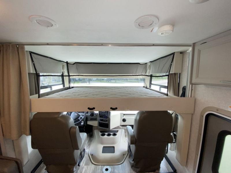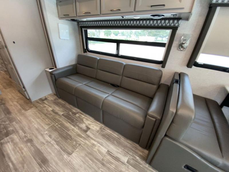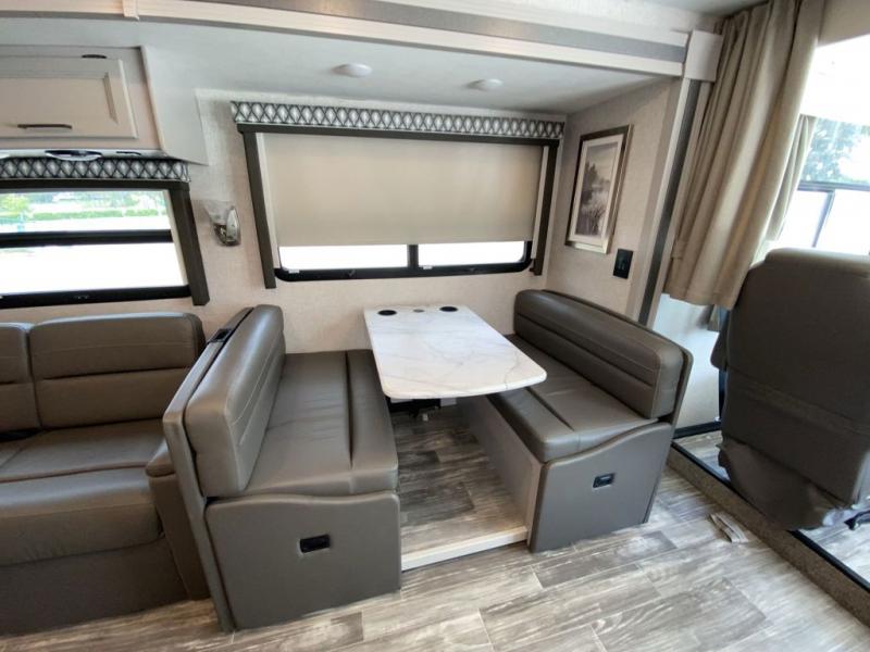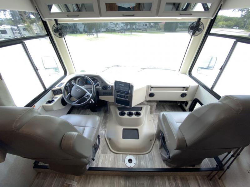 With any Hurricane Class A gas motorhome by Thor Motor Coach you will appreciate solid construction materials, like the welded tubular steel floor and the Vacu-Bond laminated roof, walls, and floor with block foam insulation. Each model sits on a Ford F-53 chassis with a 7.3L Triton V8 engine for power you can feel, plus there is an 8,000 lb. trailer hitch with a 7-pin round connector to pull your car along. The Rapid Camp+ multiplex system with Bluetooth will allow you to easily set up camp from the convenient 7" touchscreen provided, and the Winegard ConnecT WiFi extender +4G will let you catch up on work if needed. The Hurricane includes pressed laminated countertops inside, as well as residential vinyl flooring, decorative glass and tile backsplash in the kitchen, and many more at-home comforts.