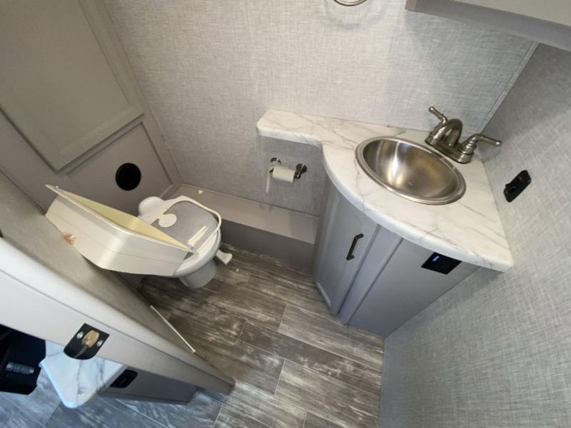A bath and a half in this coach make it perfect for trips with friends and family. You will have tons of space provided by the two slide outs, plus a sleeping capacity of six to seven people each night. The expanding sofa bed has a great view of the 39" TV, and the Dream Dinette will be great for meal times and game night. Whip up a hearty meal on the three burner gas cooktop, or use the convenient over-the-range microwave oven. There is also a 12 cu. ft. residential refrigerator and a pantry for food storage. You'll be very pleased with the master bedroom that includes a king bed, a 32" TV, and a closet to keep your clothes wrinkle-free. There is even a second closet with stackable washer and dryer prep to make life on the road easier than ever.