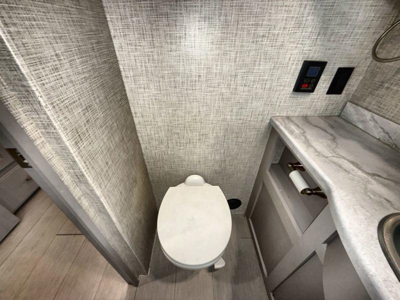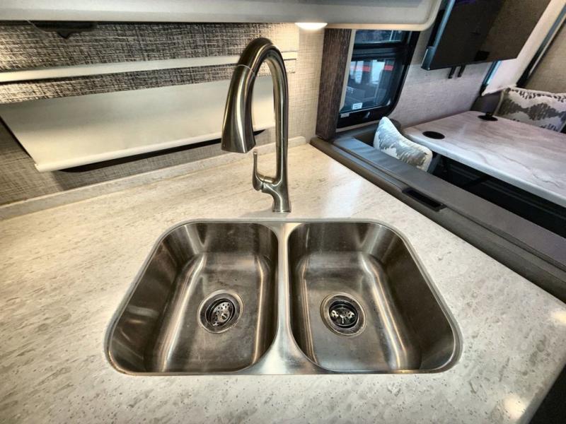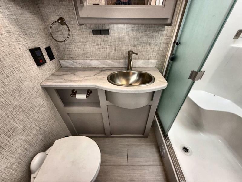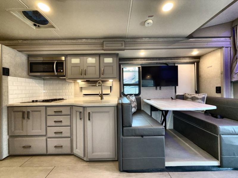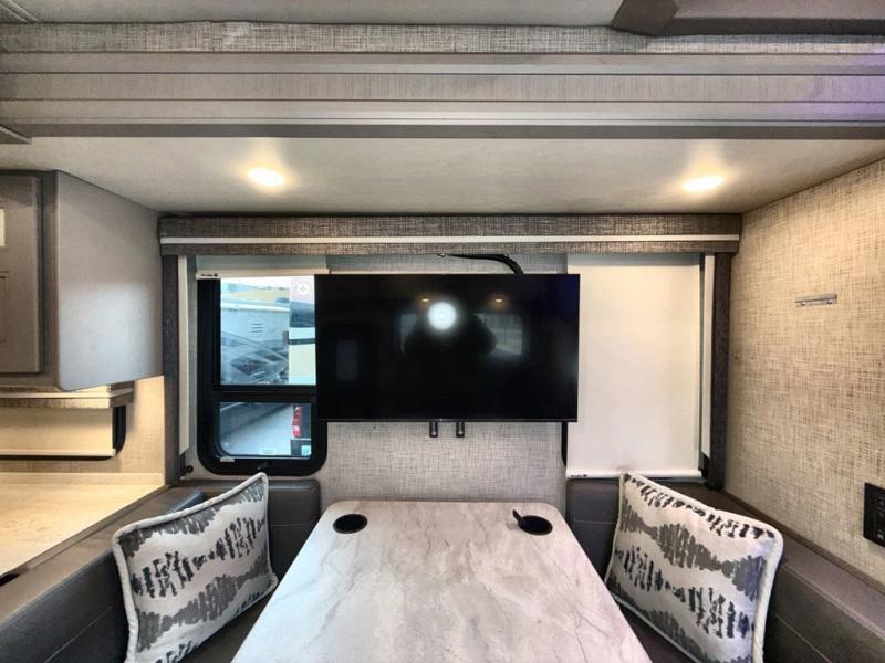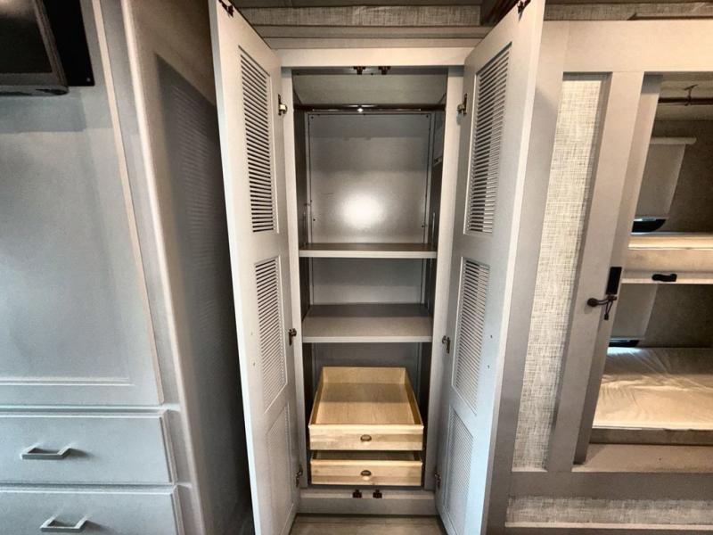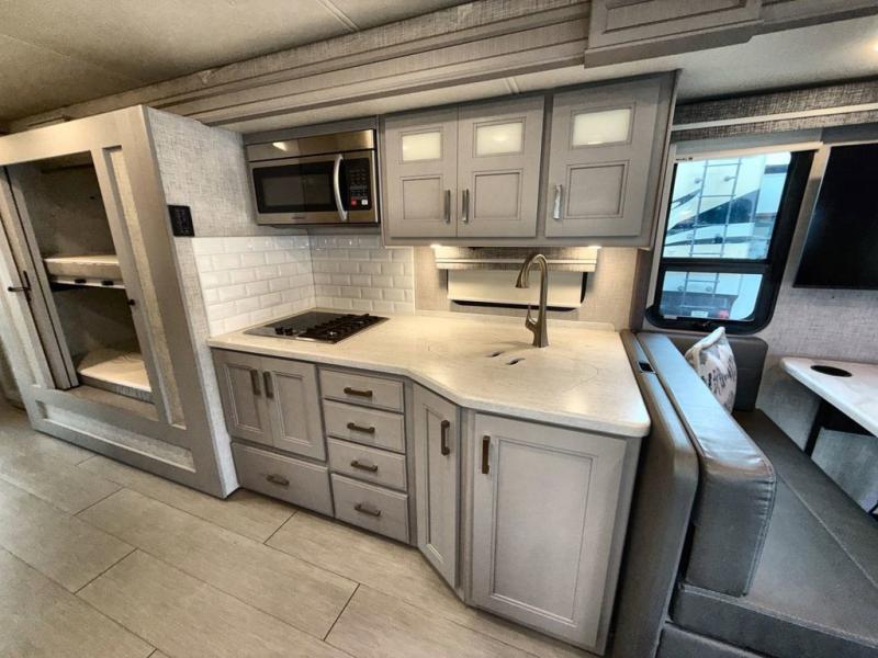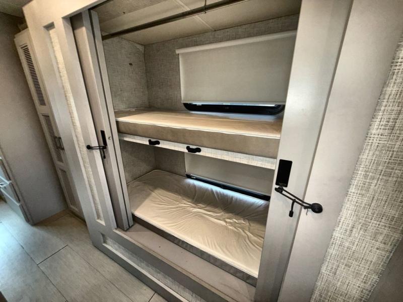 You won't even feel like you're traveling in this motorhome! The rear private bedroom offers at home comforts with a Tilt-A-View inclining king bed slide, a chest of drawers, a closet, and a 32" TV to watch movies in bed, plus there is an area to add the optional washer and dryer. The kiddos can sleep on the set of 24" x 74" bunk beds and the 52" x 80" bunk over cab. Everyone can freshen up each morning in the full bathroom with the 30" x 42" shower which has a skylight above, an Oxygenics shower head, and a Showermiser hot water recycling system. Prepare your best home cooked meals with the two burner high output gas range top with single induction cooktop and enjoy them at the 78" dream dinette. The theater seating has the perfect view of the 39" TV above the dinette, but you could switch the theater seating out for an optional sofa for more seating space.