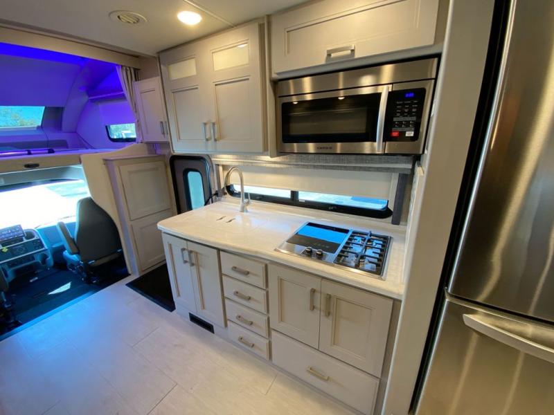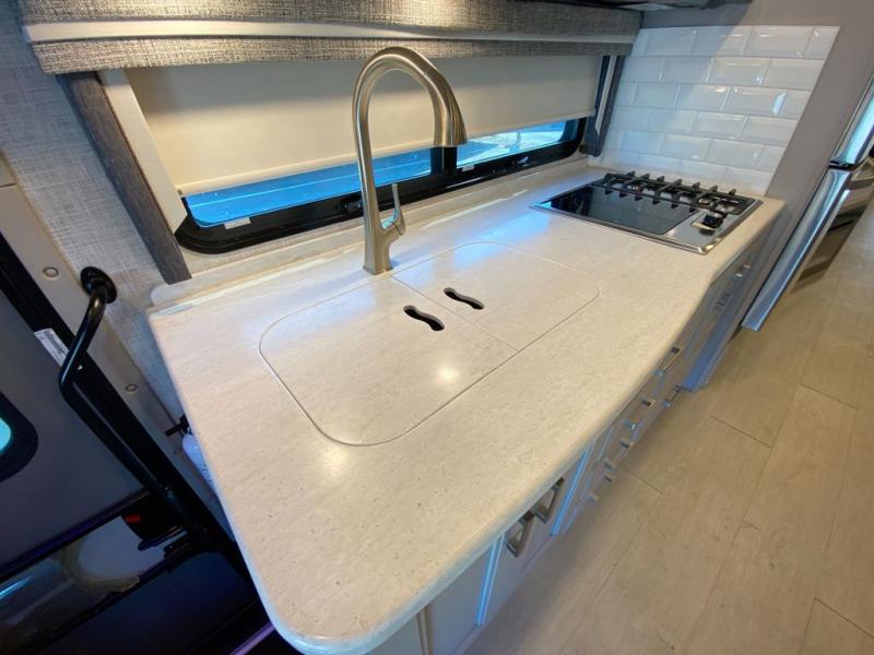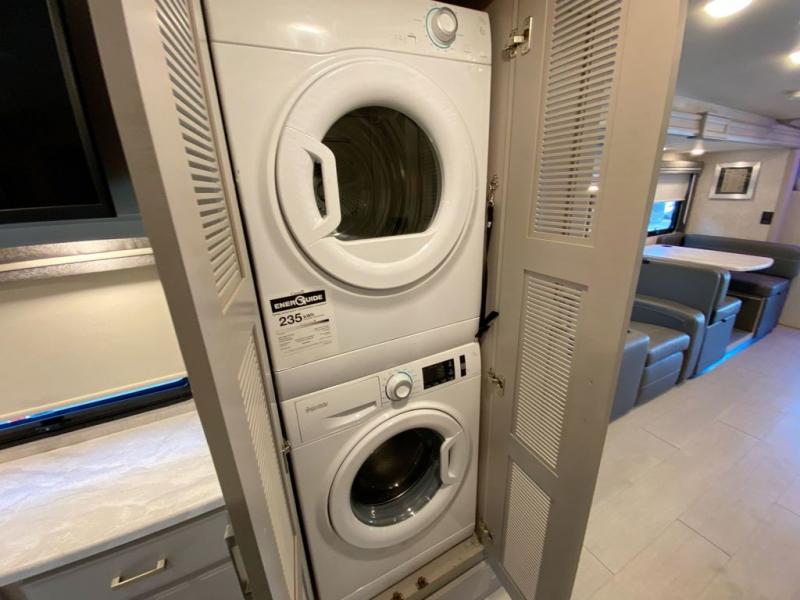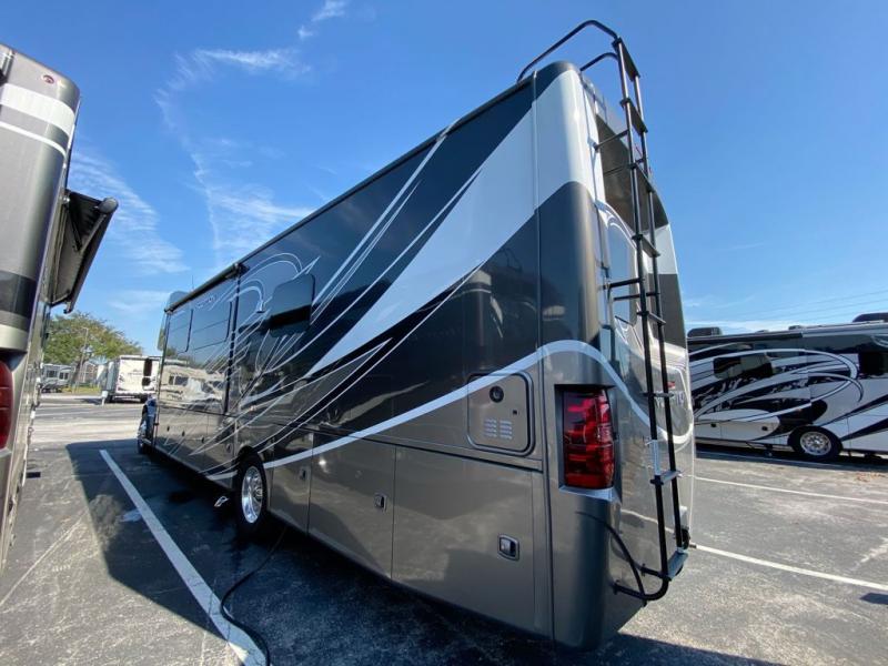 Experience a home away from home with this motorhome! After a long day of traveling, you can rest up on the Tilt-A-View inclining king bed slide in the master suite which also has a closet and a dresser with a 32" TV or you can take a nice, hot shower in the full rear bathroom with the 30" x 36" shower. The Oxygenics shower head provides an even better showering experience and the skylight above adds more head room. Enjoy a meal prepared with the two burner high output gas range top with single induction cooktop or play a card game at the 78" dream dinette then relax in the theater seating which can be switched out for an optional sofa instead. You will also have a perfect view of the 40" TV and fireplace, but you could even watch a movie with the exterior 40" TV underneath the 17' patio power awning with LED lighting!