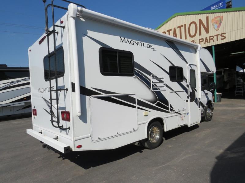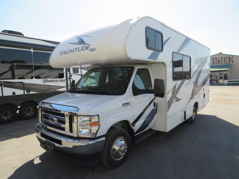 Enjoy driving the Magnitude GA motorhome by Thor Motor Coach that is built on a Ford E-Series or optional Chevy chassis, with a welded tubular aluminum roof and sidewall cage construction, a vacuum-bond laminated roof, walls and floor with block foam insulation, a slick fiberglass exterior with a standard graphics package, and lighted rotocast storage compartments for exterior storage. The interior provides residential vinyl flooring, high-sheen flat panel cabinet doors with Nickel finish hardware, decorative glass inserts in the kitchen overhead cabinets doors, pressed laminated countertops throughout, a wall cubby with a net and USB charging port, plus so much more giving you comfort, convenience and a place to make memories that will last a lifestyle.