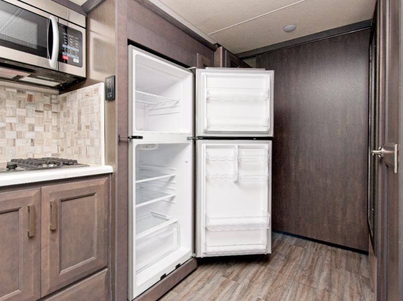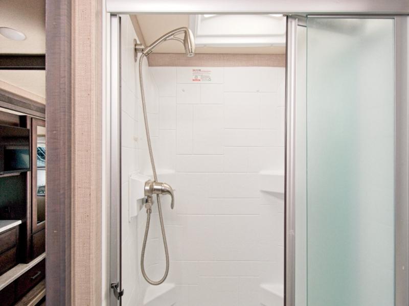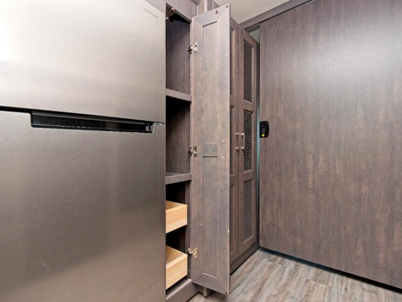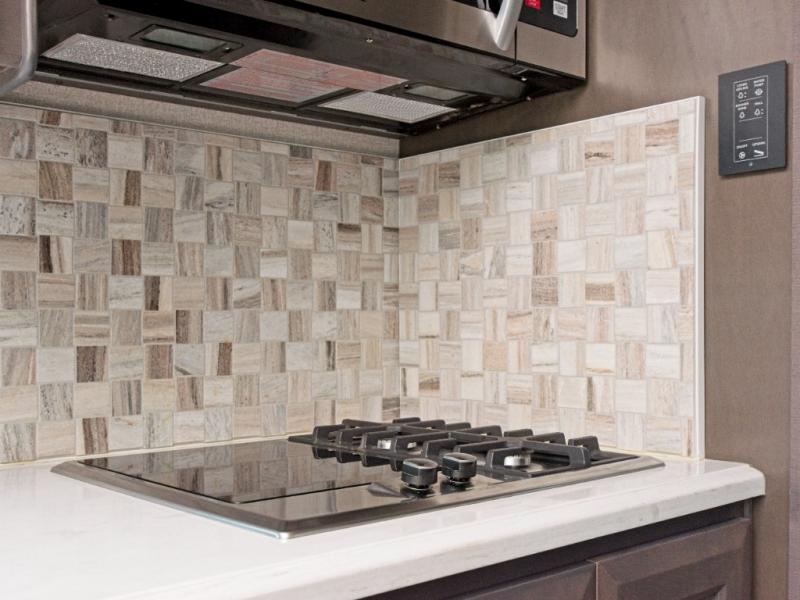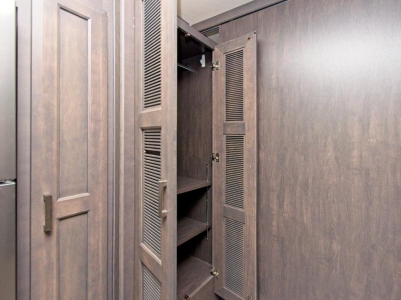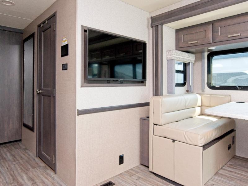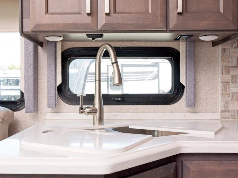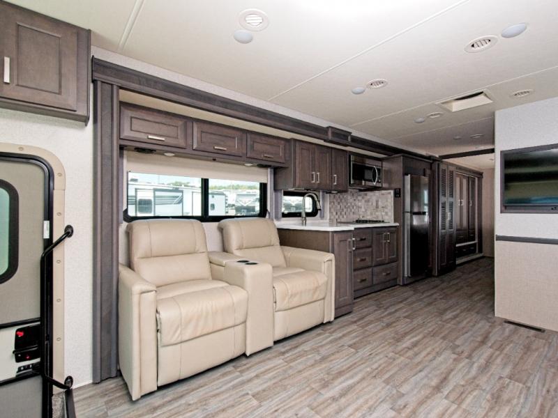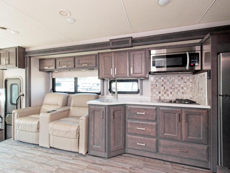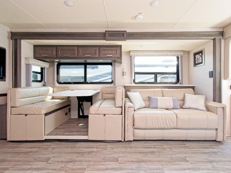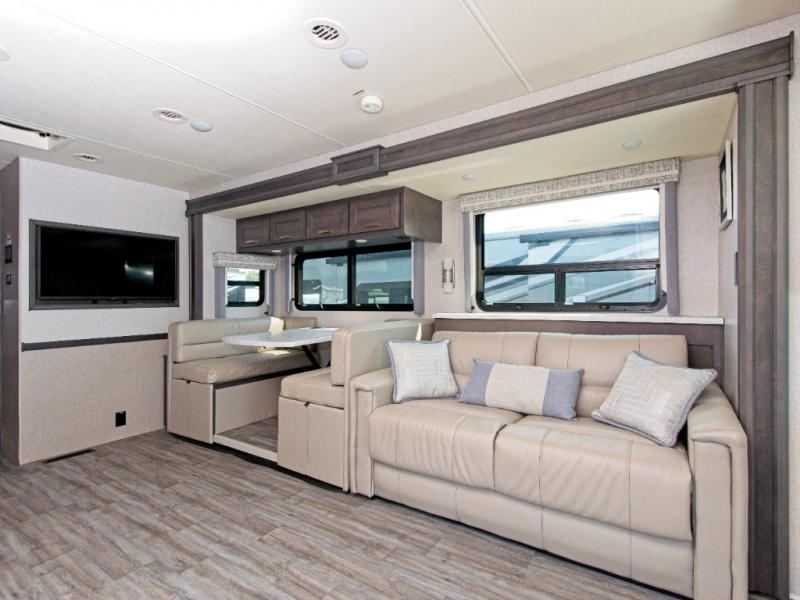 Inside, you'll find residential vinyl flooring, leatherette furniture, and satin-finish cabinetry with solid wood doors and nickel hardware—all combining to create a truly upscale RV experience.
